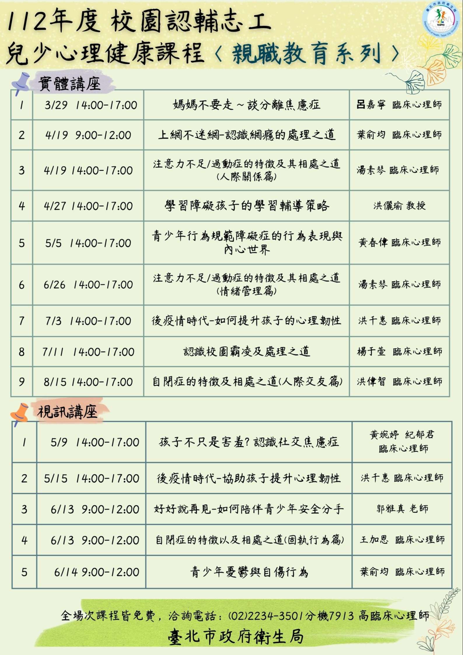 二、衛生局為增進校園認輔志工兒少相關心理衛生知能,以及家長照顧特殊兒少之親職能力,爰辦理旨揭課程。鼓勵認輔志工及家長報名參加。