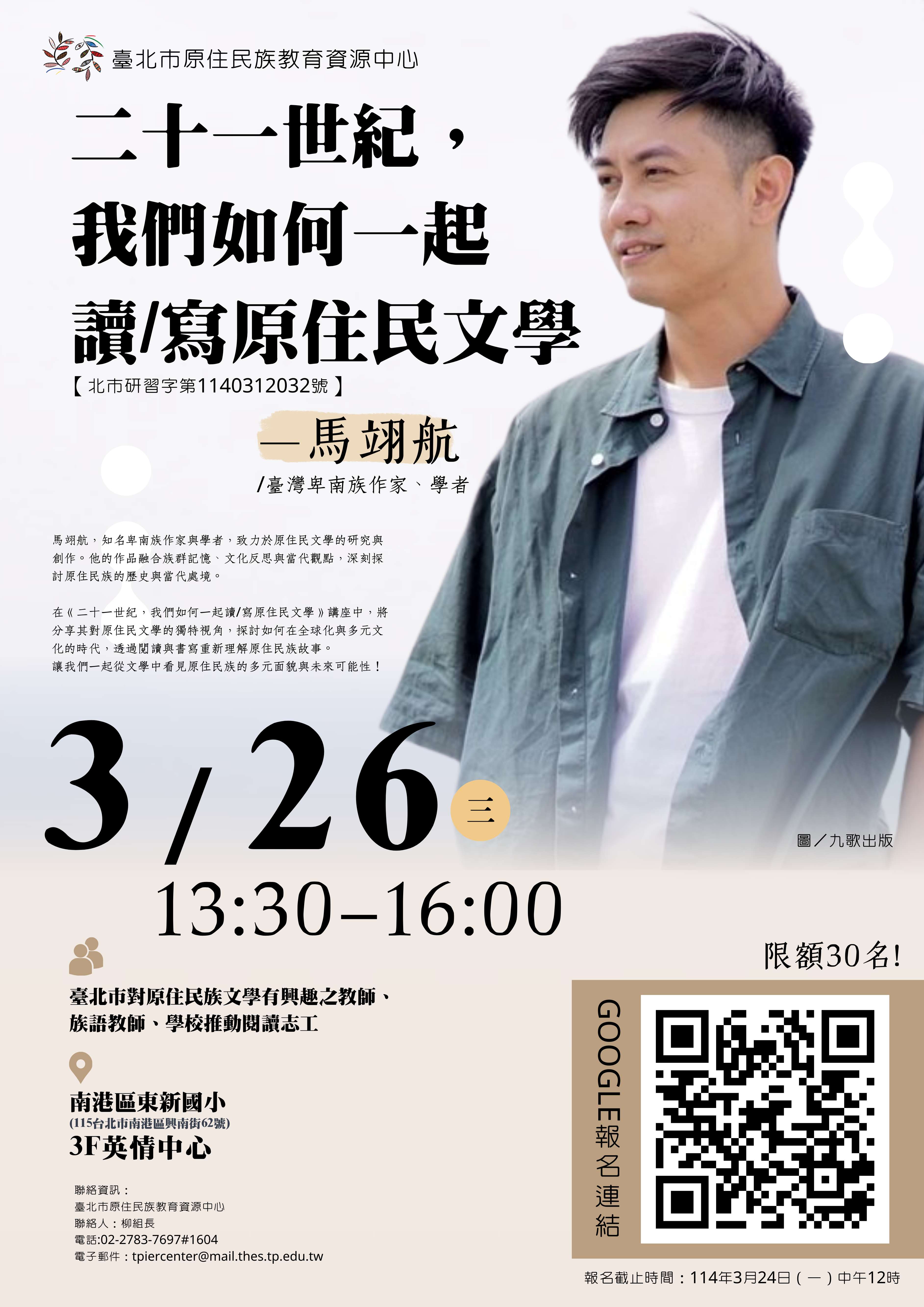 二、旨案工作坊研習資訊如下: (一)講座主題:二十一世紀,我們如何一起讀寫原住民文學 (二)講師:馬翊航/臺灣知名卑南族作家、學者 (三)北市研習字第1140312032號 (四)研習時間:114年3月26日(星期三) 13:30-16:00 (五)研習地點:東新國小 3F 英情中心(台北市南港區興南 街62號) (六)研習對象:臺北市公私立國高中、小學教職員、對原住民族文學有興趣之人員、族語教師、學校推動閱讀志 工。