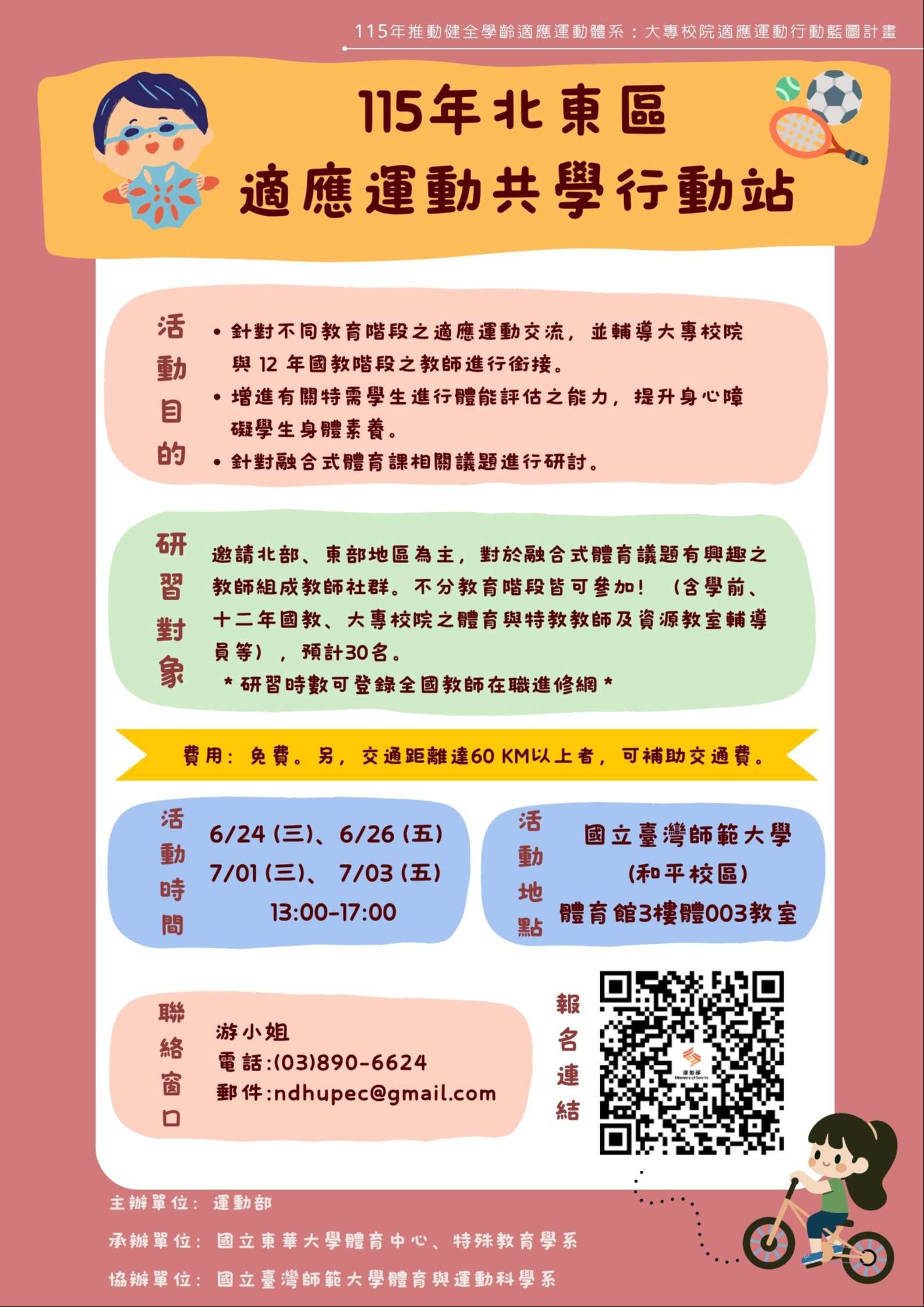 四、本案如有相關詢問事項,請洽詢東華大學專案助理:游小 姐(電話:03-8906624、電子信箱:ndhupec@gmail. com)。