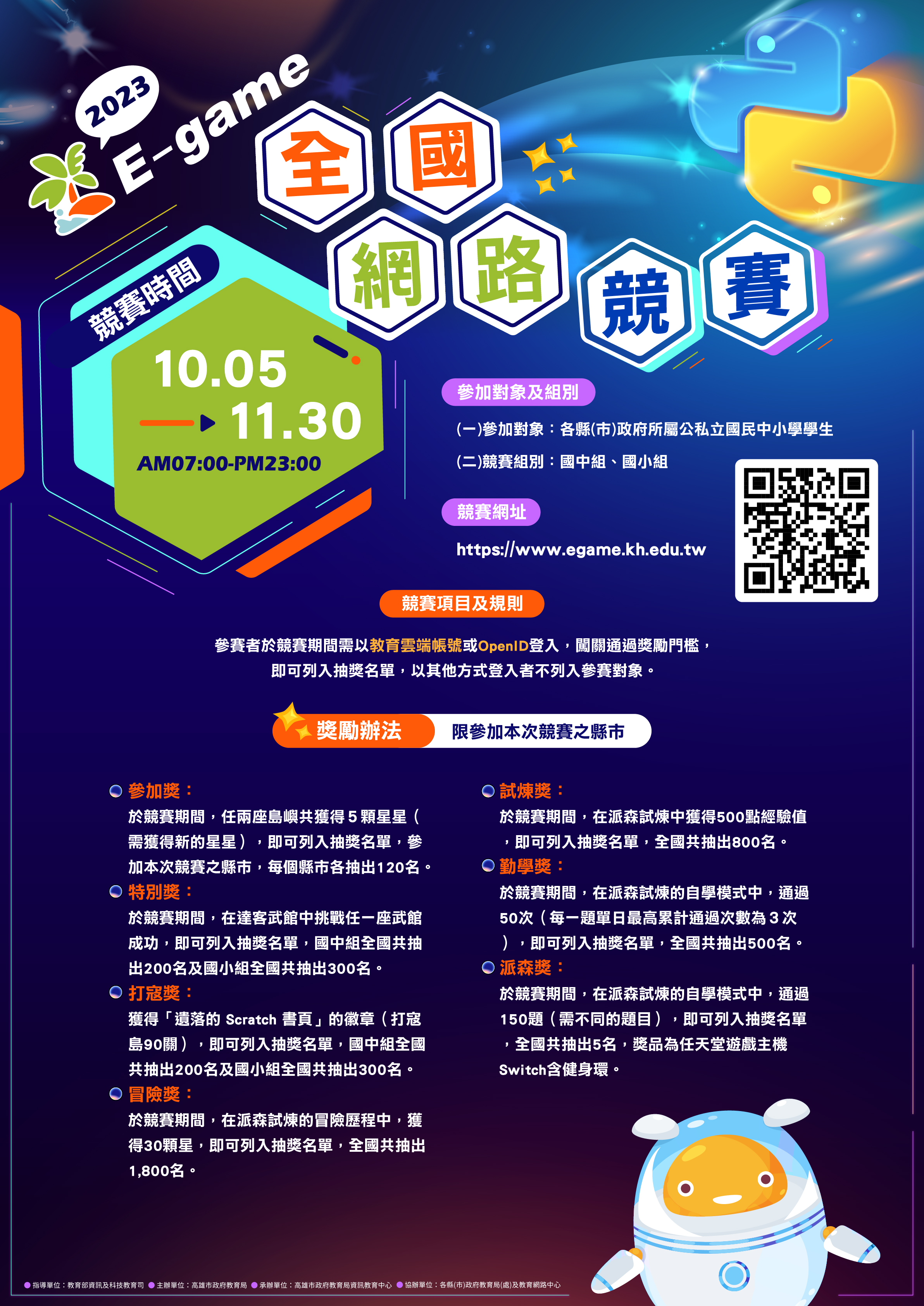 (七) 派森獎:於競賽期間,在派森試煉的自學模式中,通過150題(需不同的題目),即可列入抽獎名單,全國共抽出5名(限參加本次競賽之縣市),獎品為任天堂遊戲主機 Switch含健身環。
