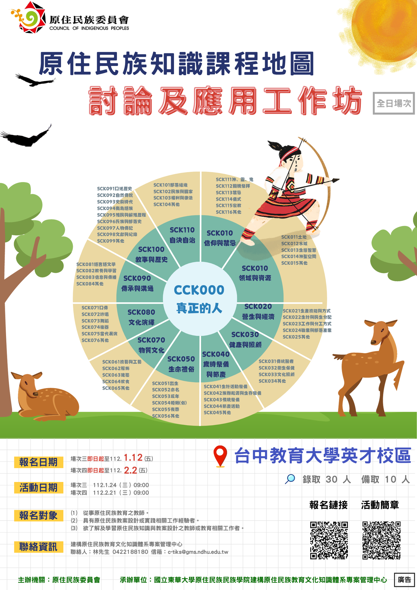 二、活動辦理導入原住民族知識雲端平台系統應用與操作,藉 由資訊科技應用將國小、國中及高中不同學習階段進行原 住民族教育文化課程地圖之應用與討論,參與者可以獲得 資訊科技導入教育課程製作相關知能,並希望能有效轉化 為實務經驗或研究,以利推動原住民族知識課程發展以及 增能教師原住民族知識課程教學能量,鼓勵從事原住民族 教育之教師、相關學者或原住民教案設計實踐工作者,踴 躍報名。