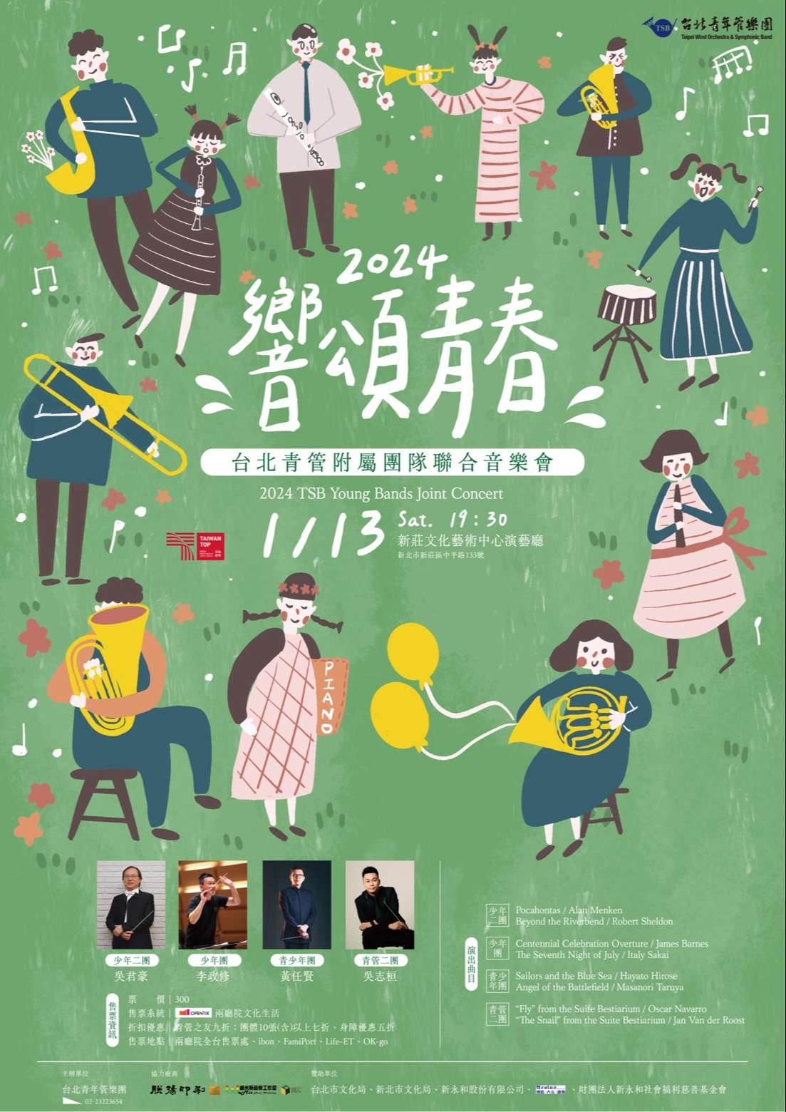 一、2024台北青管附屬團隊聯合音樂會,由台北青年管樂團二團、台北青年管樂團附屬青少年團、台北青年管樂團附屬少年團、台北青年管樂團附屬少年二團演出;曲目豐富多元,好聽悅耳,展現年輕音樂家的創意與活力,歡迎闔家一同前來欣賞。