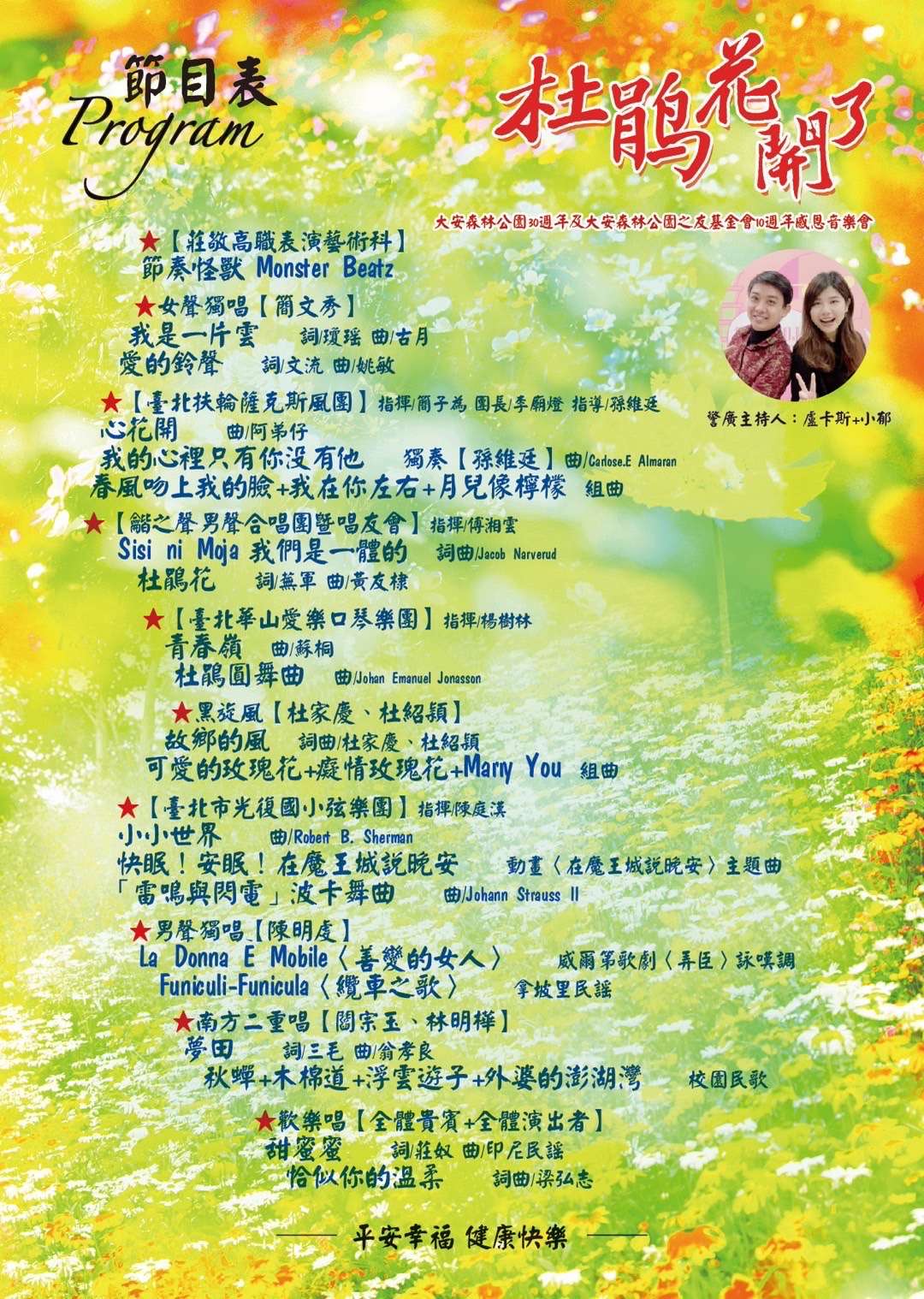 一、被譽為城市之肺的大安森林公園開園迄今屆滿30周年,而長年致力於公園保育及維護的大安森林公園之友基金會也成立10周年,為了慶賀生態環境守護有成,特結合今年「臺北杜鵑花季」舉辦音樂會活動。