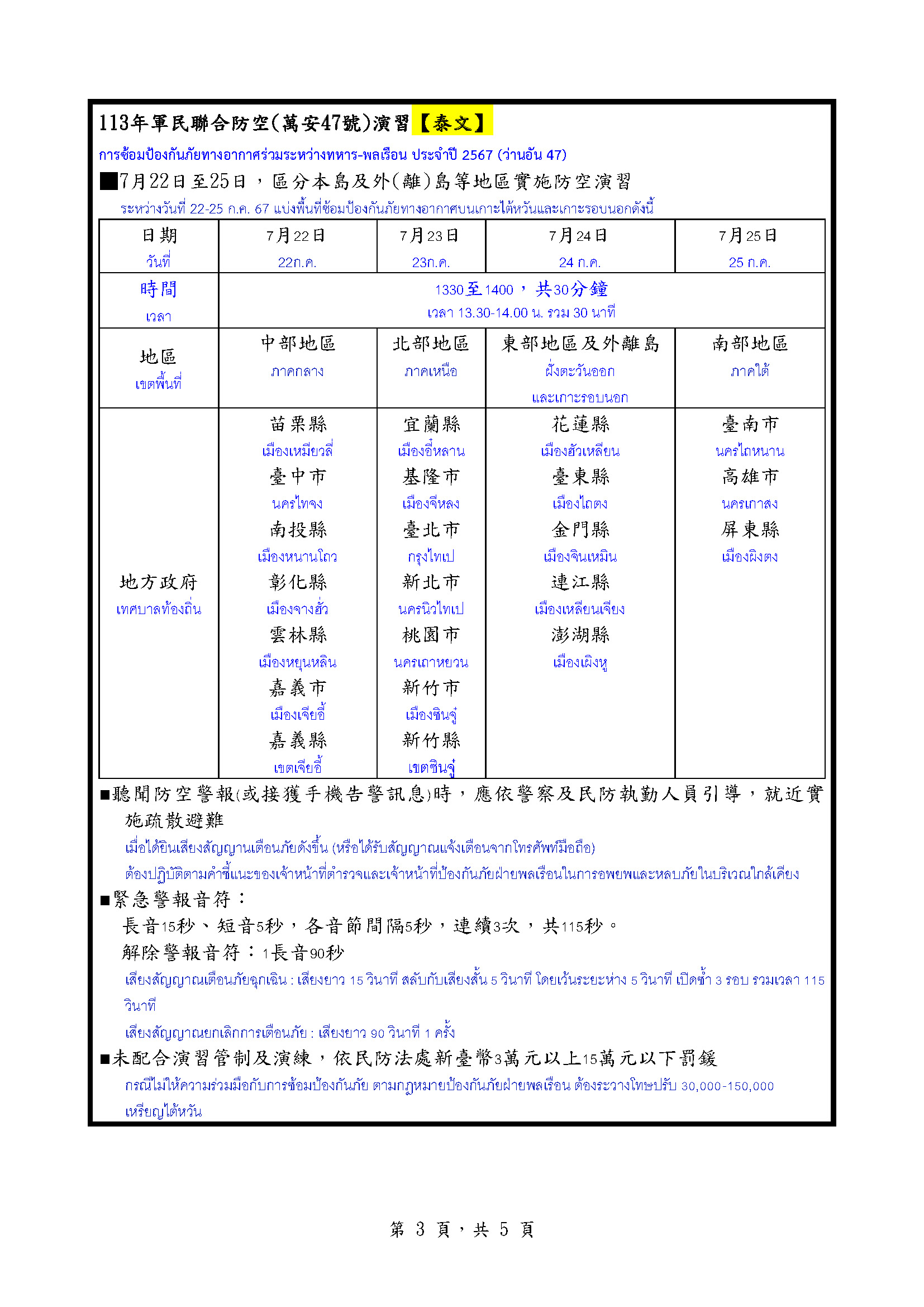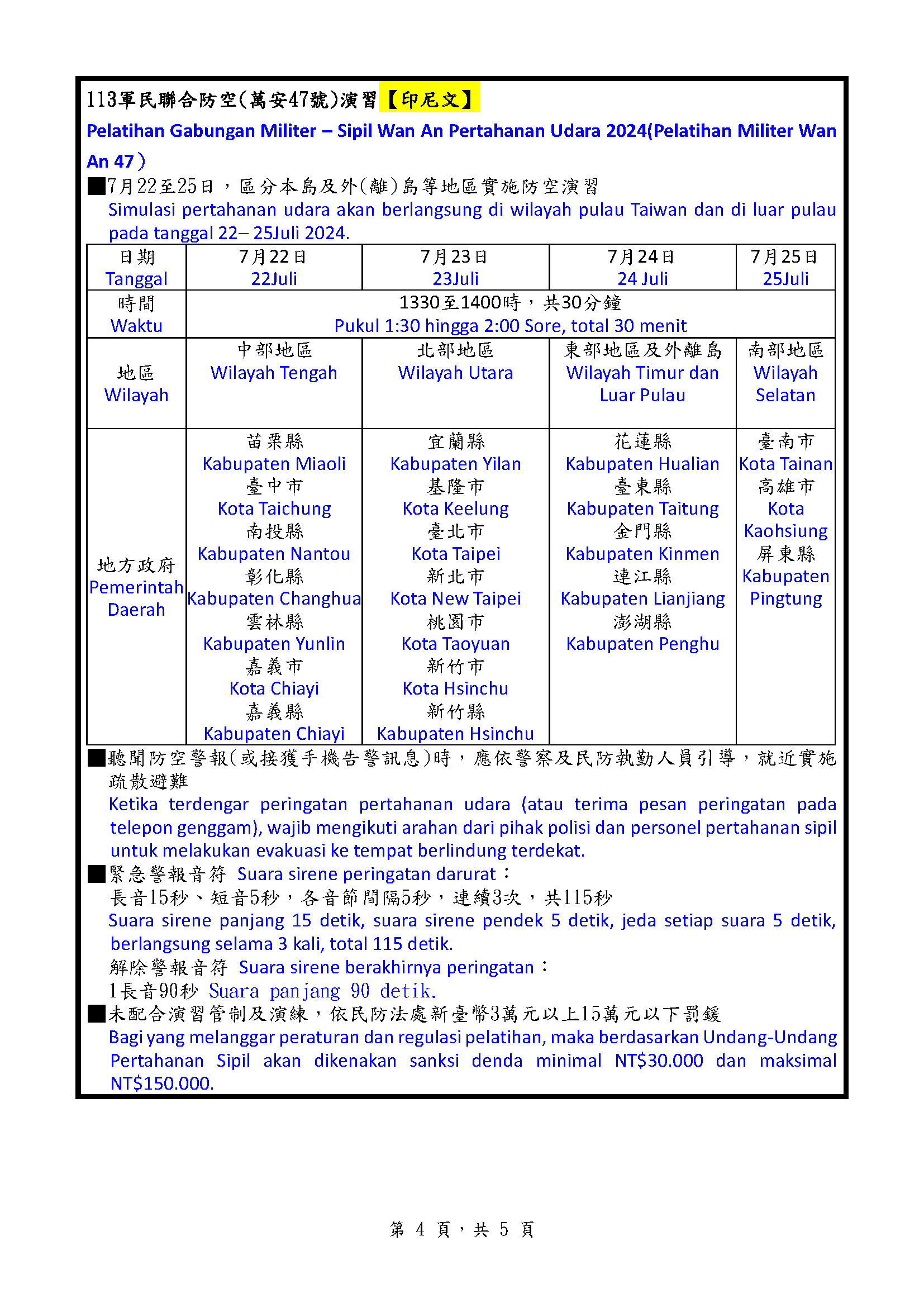 113年軍民聯合防空(萬安47號)演習多國語言文宣資料