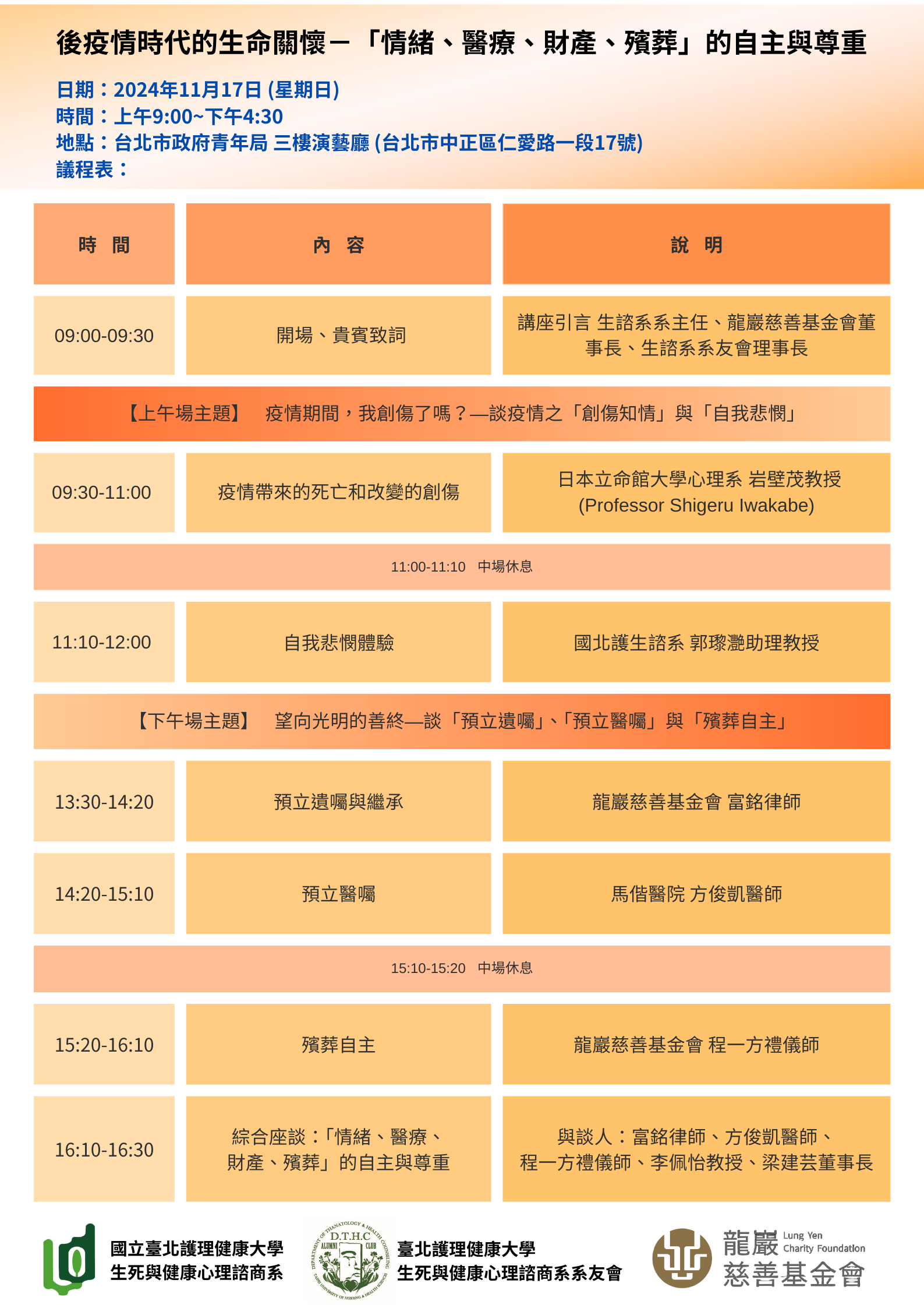 二、講座主題:「後疫情時代的生命關懷—『情緒、醫療、財產、殯葬』的自主與尊重」。