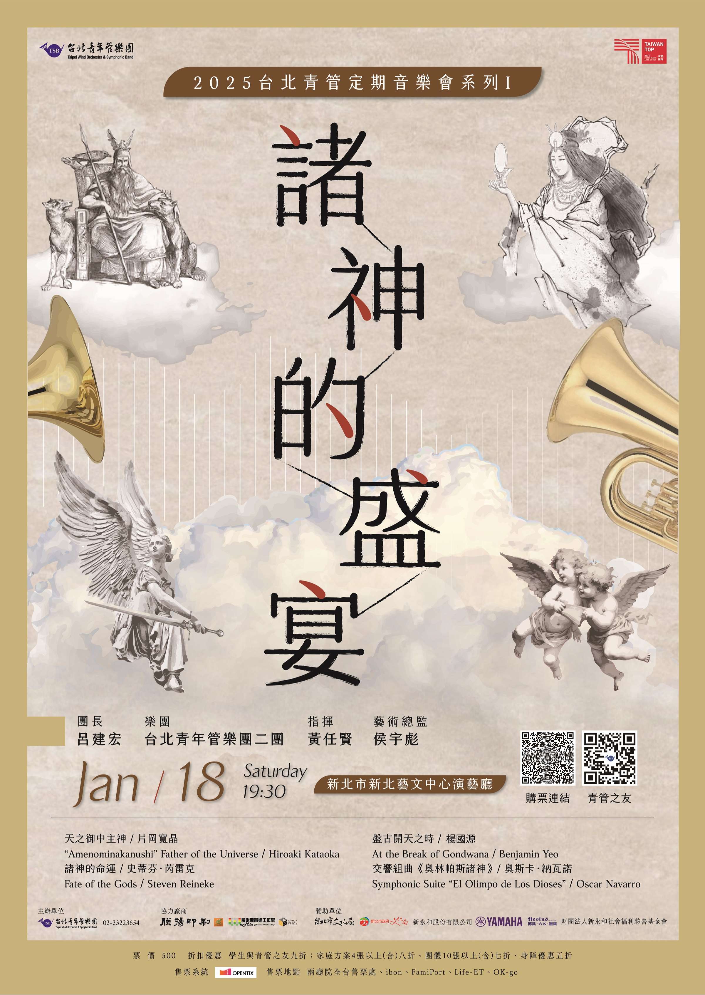 一、2025台北青管定期音樂會系列I,精選描寫東西方如日本、北歐與希臘眾神明的音樂,由國家交響樂團法國號助理首席黃任賢老師,指揮台北青年管樂團二團演出。