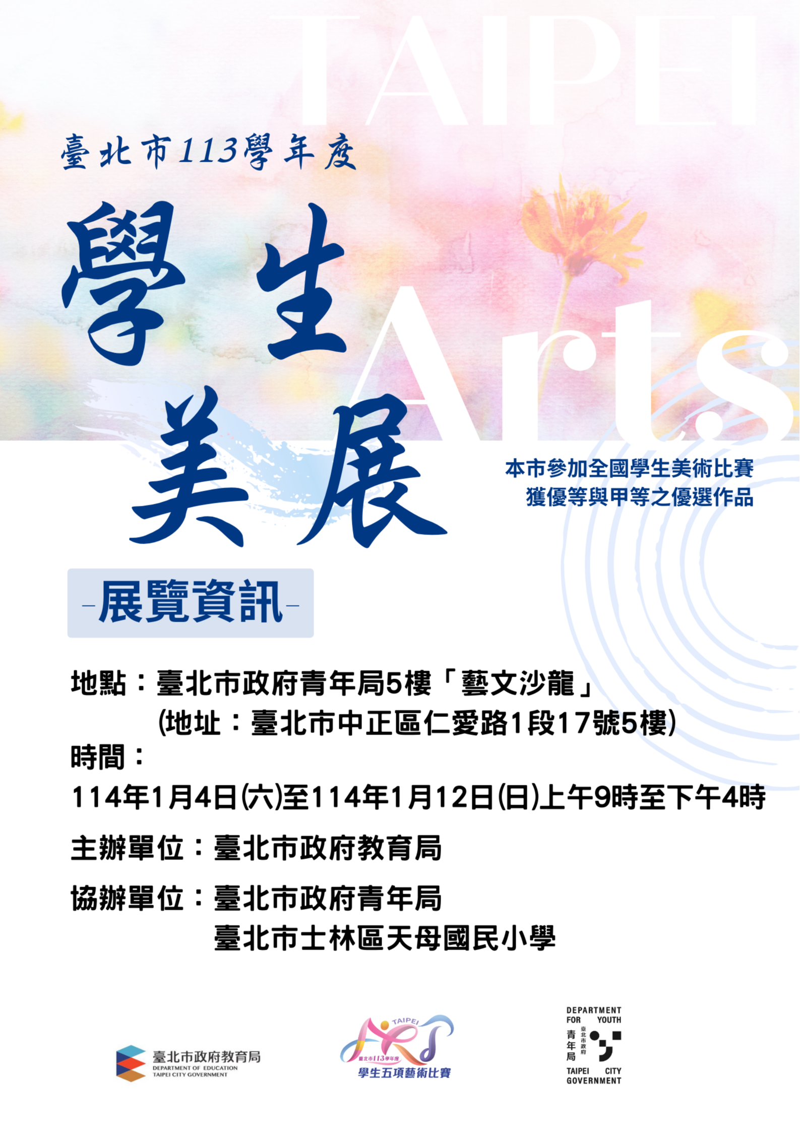 二、為提供優秀作品展示及相互交流機會,並激勵其持續發揮 創意與創作,豐富臺北詮釋,提升本市藝文之能見度及競 爭力,本局特與本府青年局共同舉辦旨揭學生美展;展覽 資訊如下 (一)地點:臺北市政府青年局5樓「藝文沙龍」(地址:臺北 市中正區仁愛路1段17號5樓)。 (二)時間:114年1月4日(星期六)至114年1月12日(星期 日)上午9 時至下午4時。