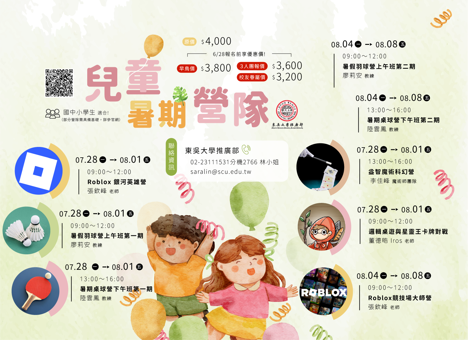 一、本次共計招生九個研習營:Roblox銀河英雄營、邏輯桌遊與星靈王卡牌對戰、益智魔術科幻營、暑期桌球營下午班第一期、 假羽球營上午班第一 、Roblox 競技場大師營、暑期桌球營下午班第二 、暑假羽球營上午班第二 、 籃球主播營 。