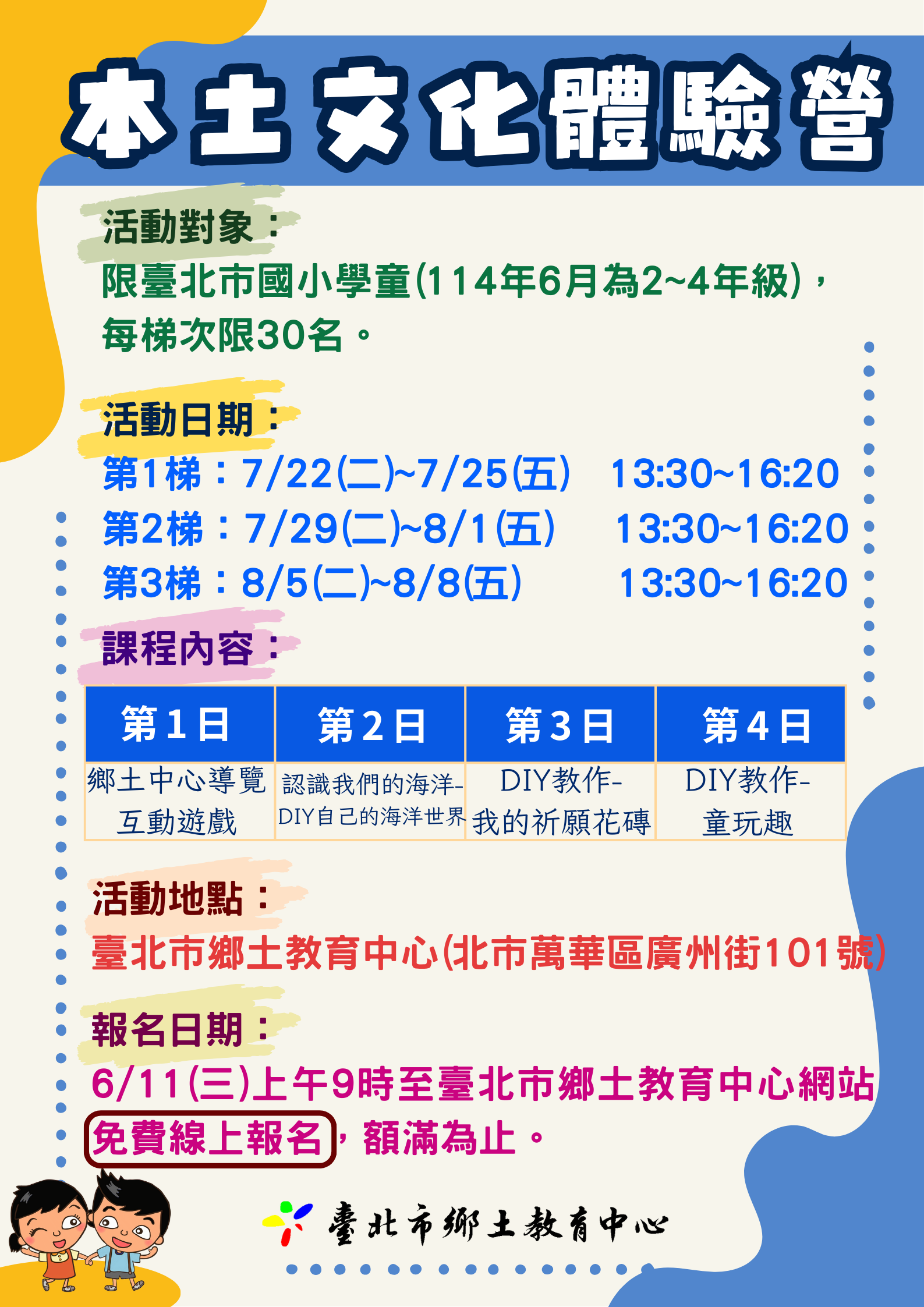 二、臺北市鄉土教育中心利用暑假舉辦免費「本土文化體驗營」,以提供本市學童深入學習多方面的本土文化知識,進而達到中心推廣本土教育、深根在地文化目的。
