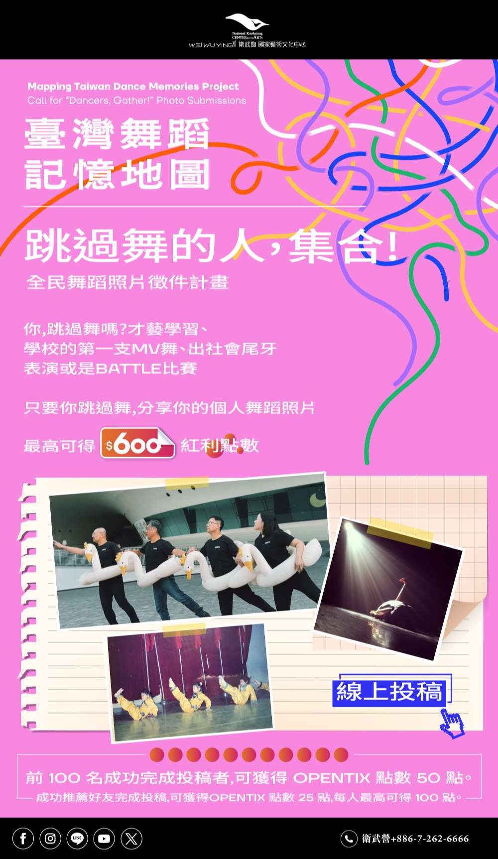 (二)「跳過舞的人,集合!」全民舞蹈照片徵件活動參考簡章(附件二)或衛武營官網網址:https://npacwwy.tw/en08gMrIj,邀請師生共同參與投稿,擴大舞蹈記憶之蒐集與交流。
