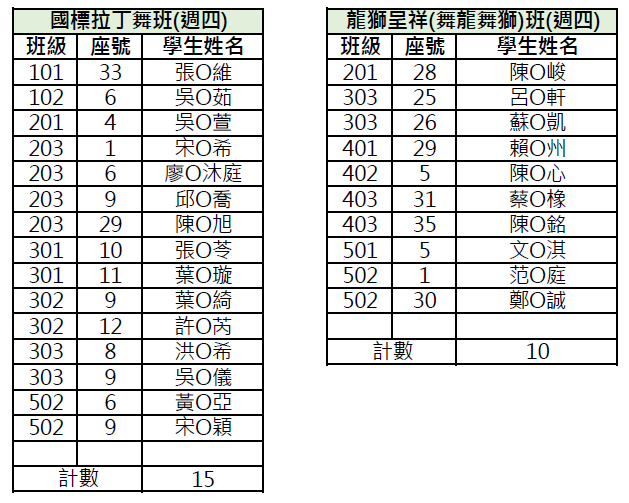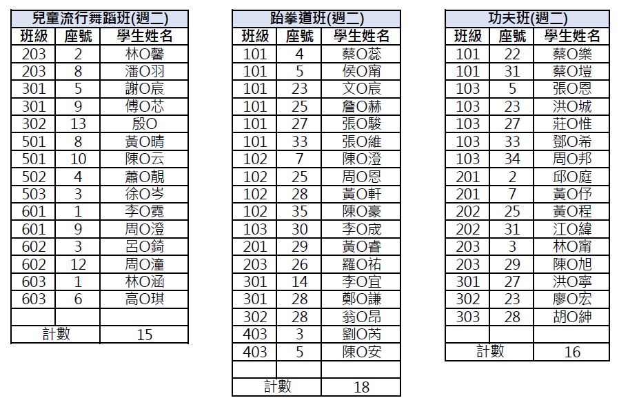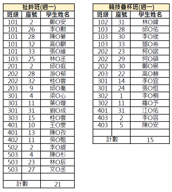 | 101 | 21 | 楊O翔 | 301 | 11 | 葉O璇 | |