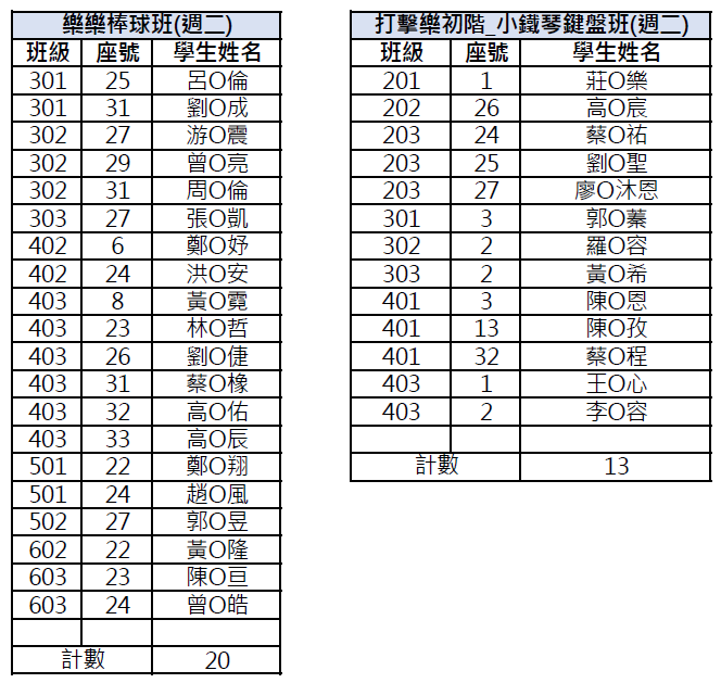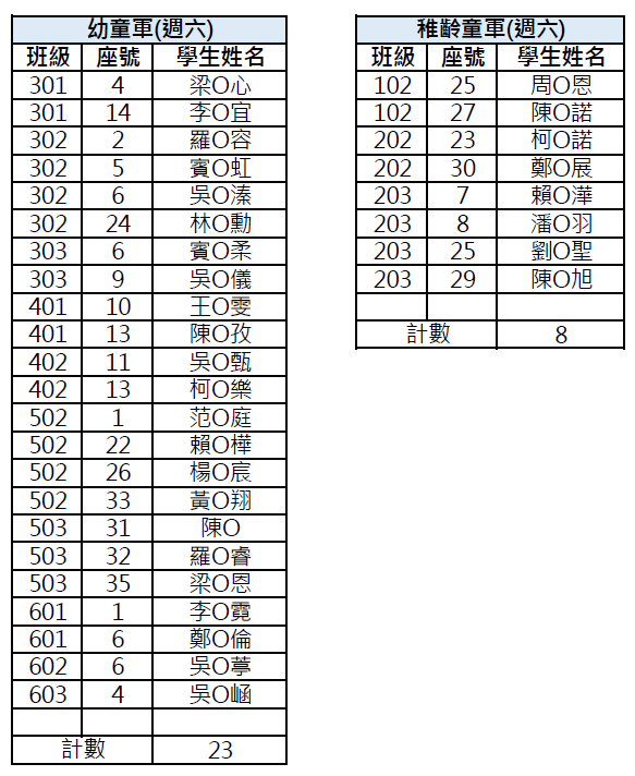 | 301 | 11 | 葉O璇 | 302 | 11 | 羅O予 | |