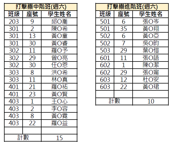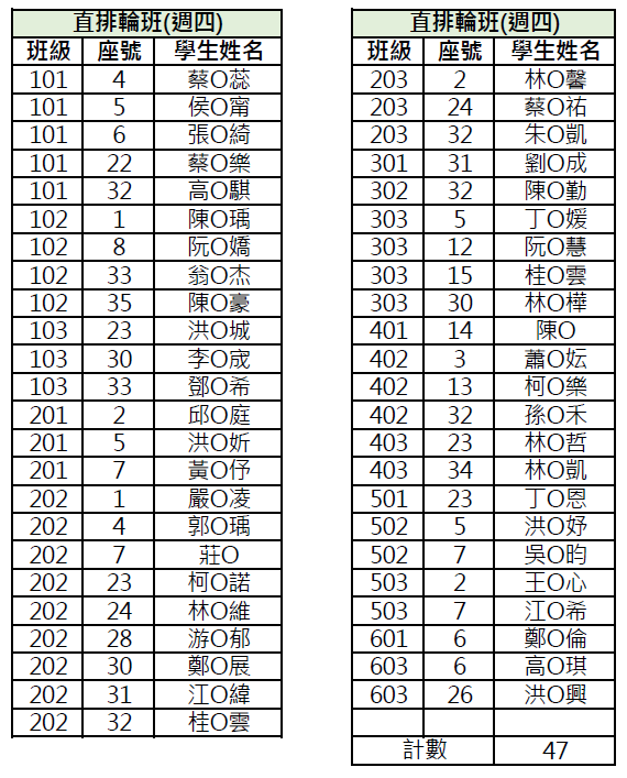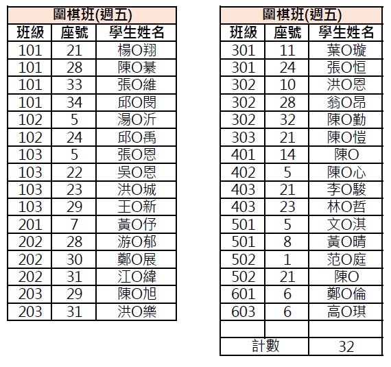 | 301 | 30 | 黃O睿 | 502 | 7 | 吳O昀 | |