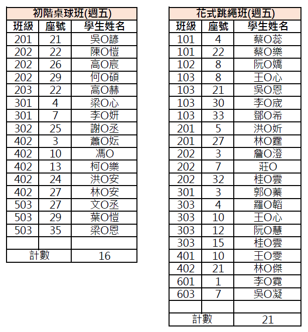 | 初階桌球班(週五) | 花式跳繩班(週五) | |||||