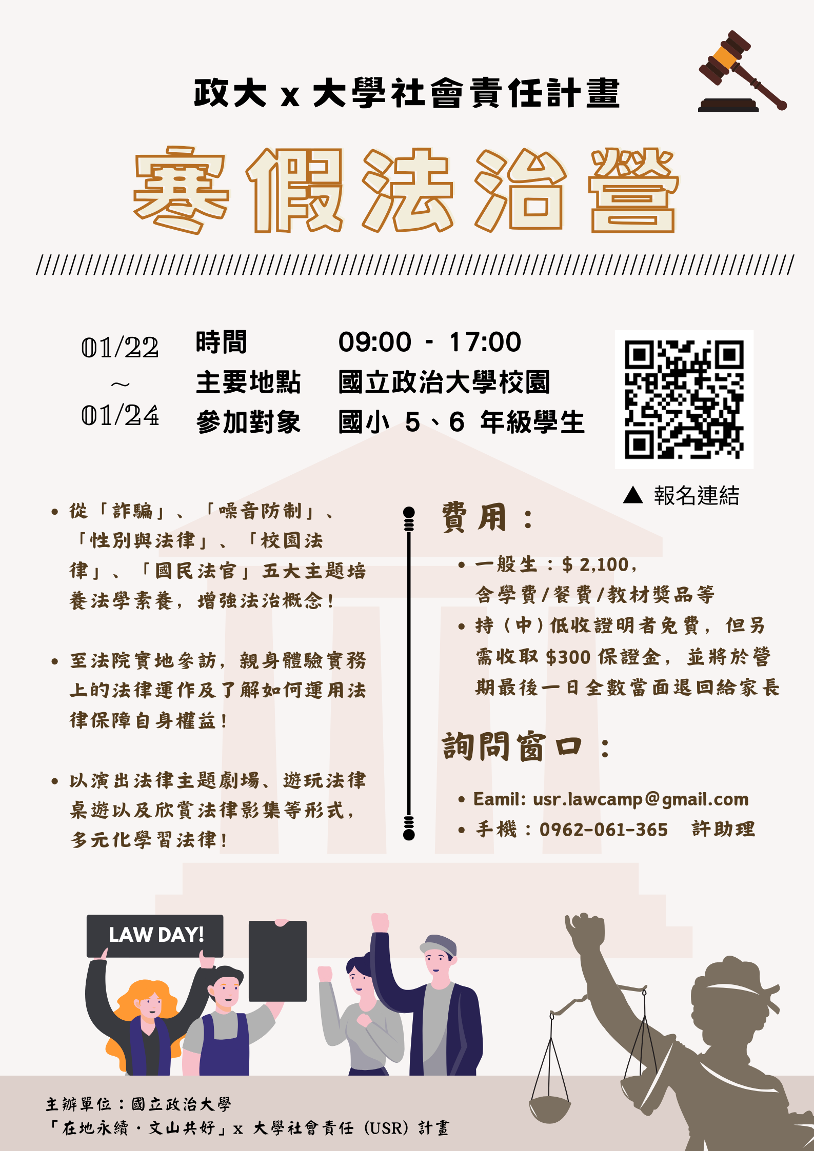 一、政大USR「在地永續.文山共好」社區支持系統打造計畫,擬於 2024年1月22日 至 2024年1月24日 於國立政治大學舉辦「國小寒假法治營」,邀請貴校五、六年級學生參與。