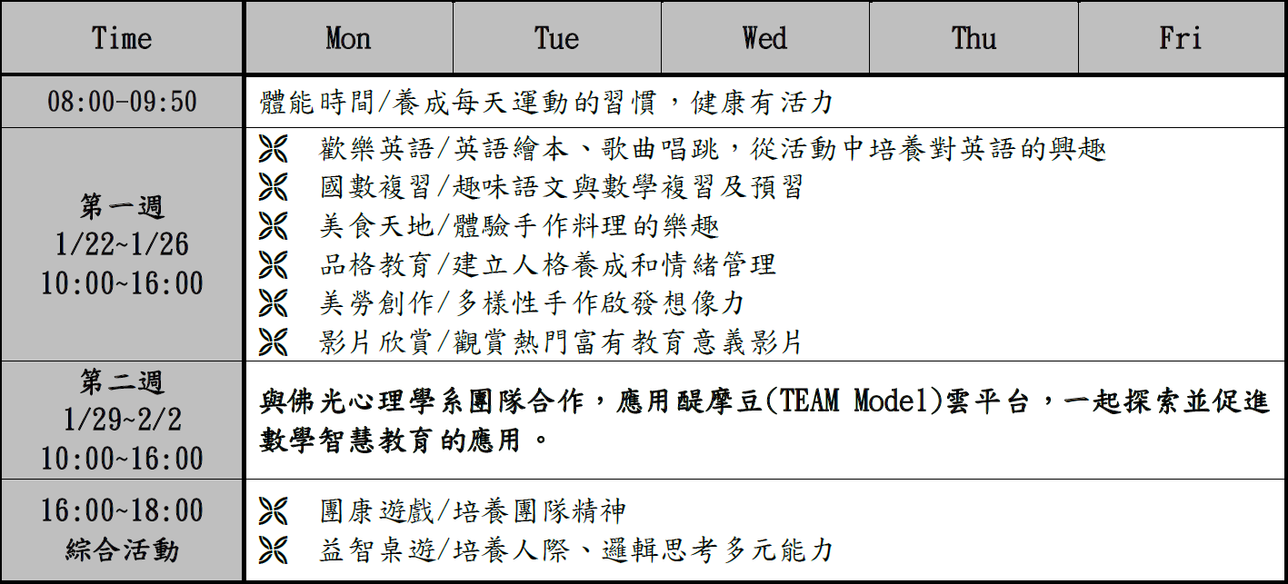 五、班級預計人數:每班以15人計,若各班報名未滿15人則採混齡編班。