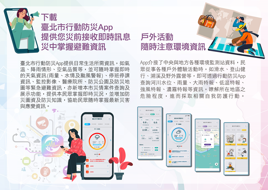 臺北市行動防災App已完成更版上架作業,本次改版採用極 簡風格搭配明亮乾淨的配色,及直覺化、友善化、視覺 化、客製化及生活化的設計原則,並導入英文介面選項, 提升使用者體驗。