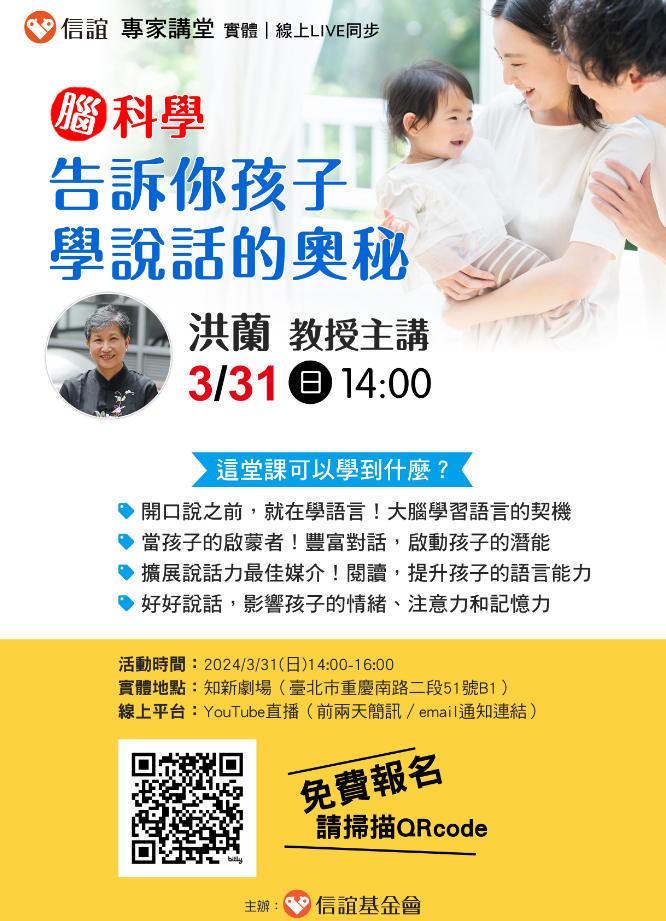 一、了解不同階段孩子的語言發展脈絡、認識學說話過程的奧 秘,有助提升孩子的語言能力!信誼專家講堂於2024年3月 31日(日)下午2:00~4:00舉辦【腦科學,告訴你孩子學 說話的奧秘】免費親職講座,實體講座與線上直播同步進 行,邀請爸媽及老師報名參加。