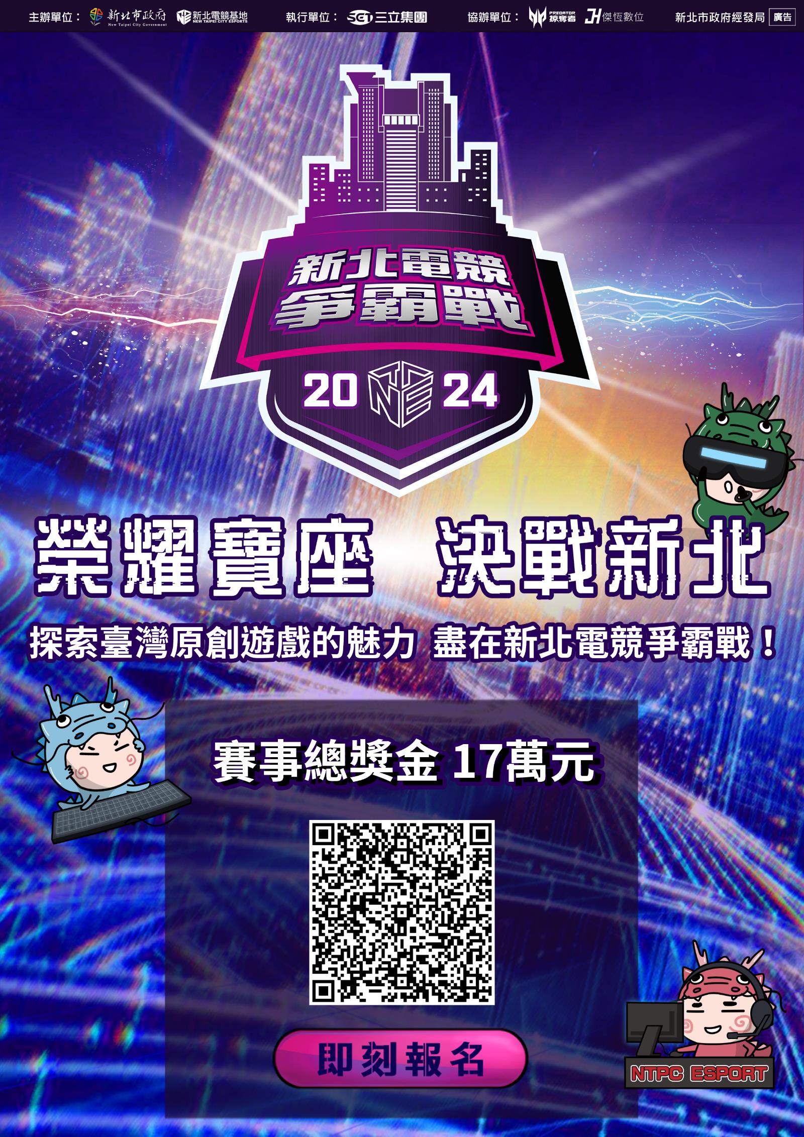 113年「新北電競爭霸戰」即日起開放報名,並且市府為推廣臺灣遊戲IP發展,競賽項目除了熱門遊戲《傳說對決》外,今年首度加入臺灣原創遊戲《G9:League of Aces》,總獎金更高達新臺幣17萬元,歡迎年滿12歲以上各路挑戰者報名參賽!