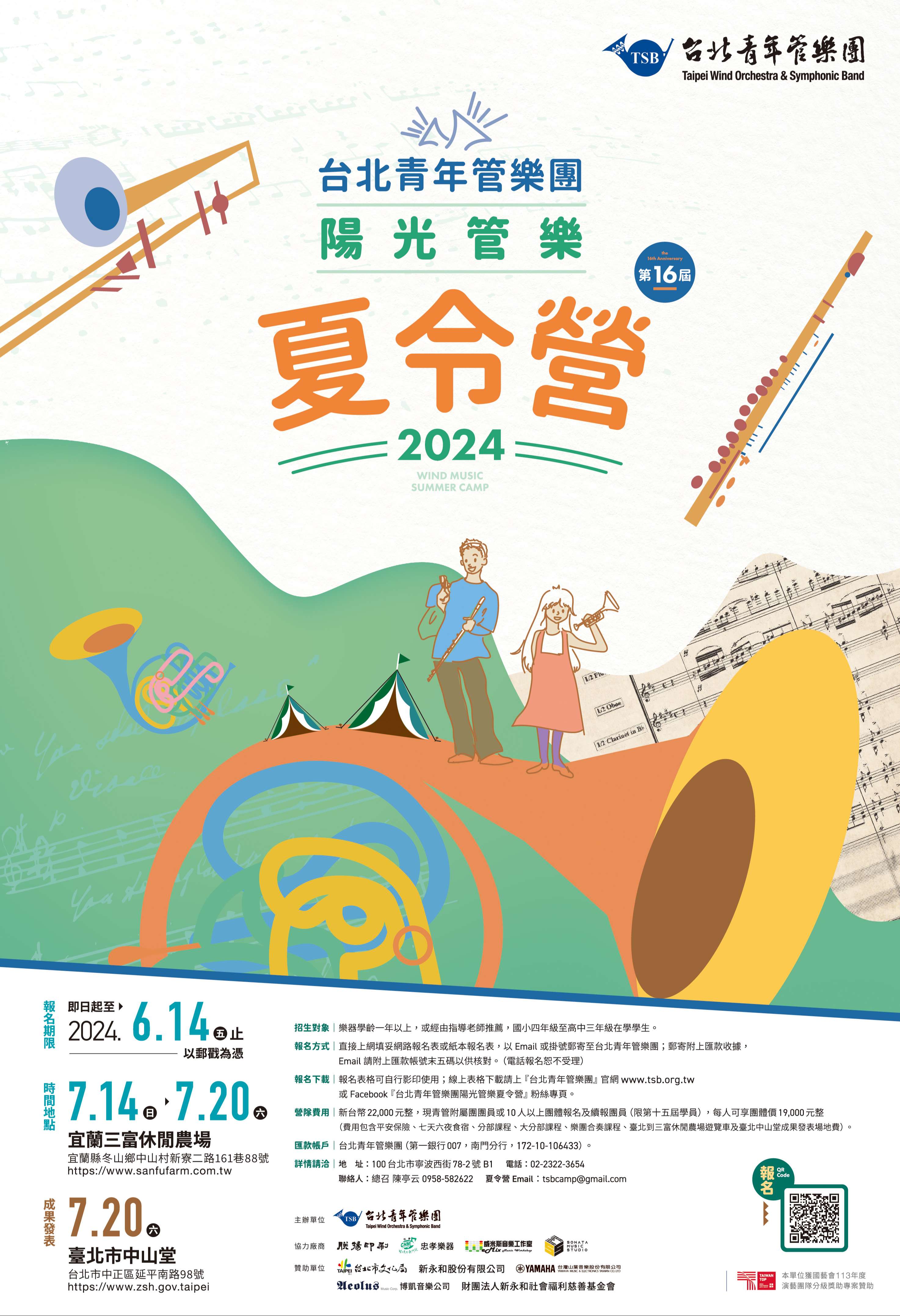 一、台北青管暑假最受歡迎的陽光管樂夏令營,聘請專業師資,規劃豐富充實課程,並規劃於113年7月20日(六)下午2點30分假臺北市中山堂中正廳舉辦成果發表會,歡迎喜愛管樂演奏學生踴躍報名參加。