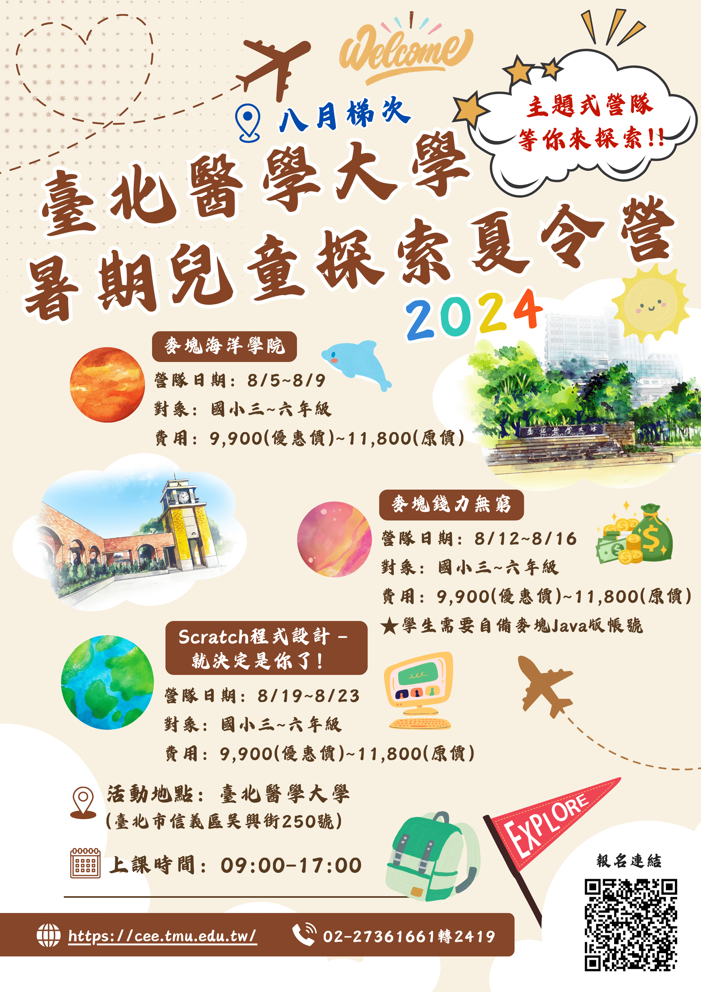 二、營隊資訊:2024臺北醫學大學暑期兒童探索夏令營擬訂於民國113年7月1日至8月23日辦理。網址 http://tmucamp.tmu.edu.tw/