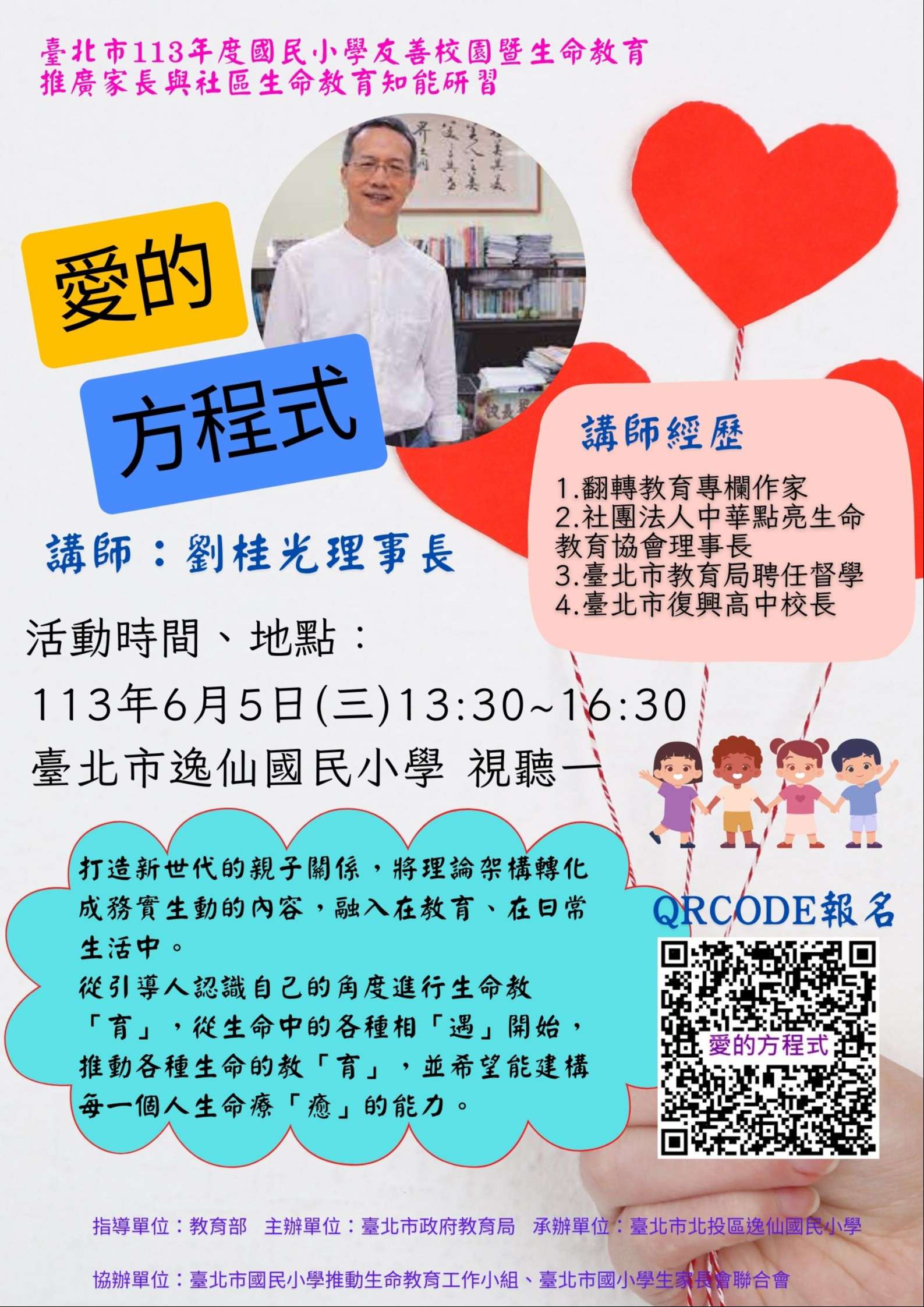 一、因應新世代的親子關係緊張,為增進家長認識生命教育及建構生命療癒的能力,特辦理旨揭講座。