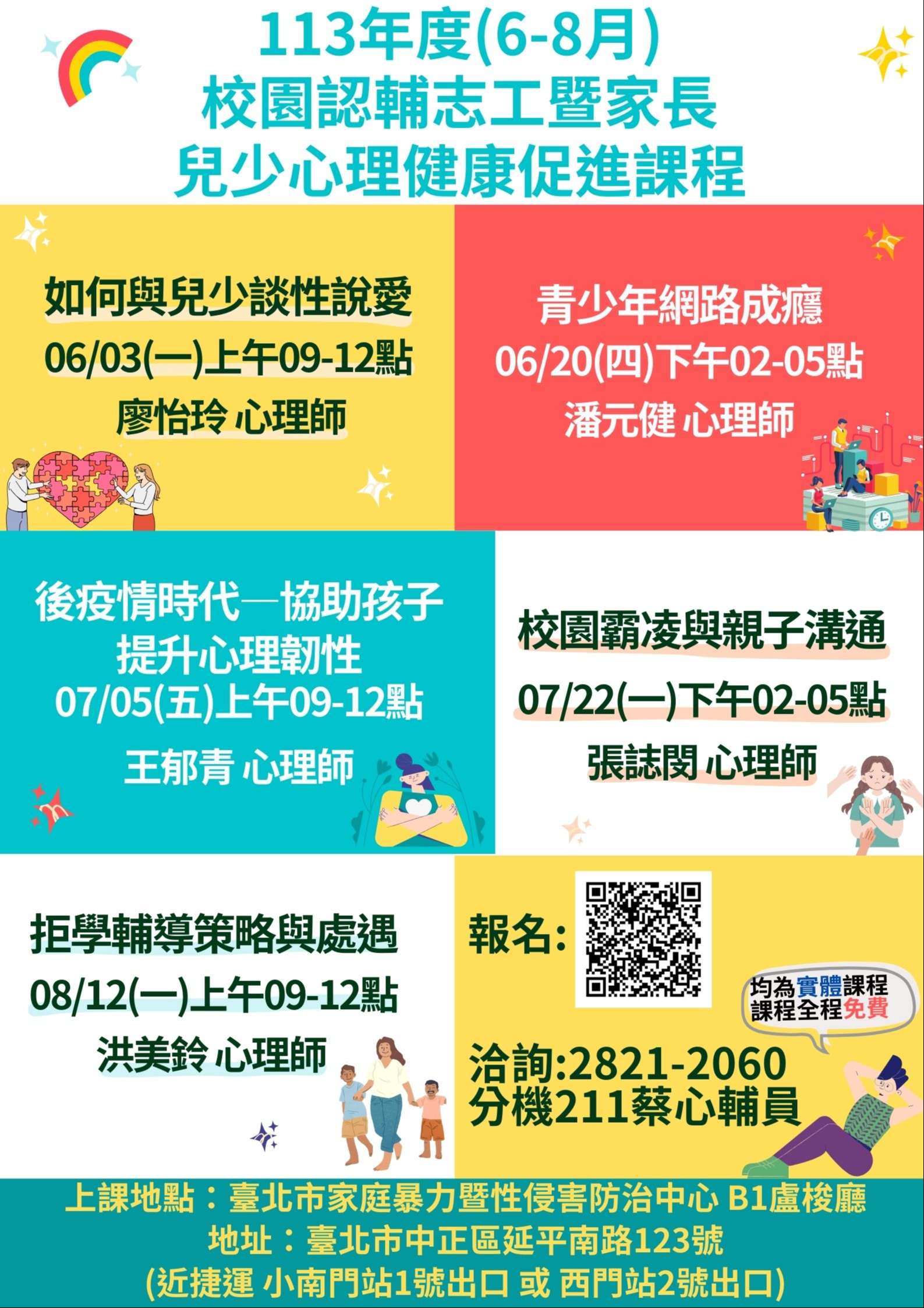 二、為增進校園認輔志工兒少相關心理衛生知能,以及家長照顧特殊兒少之親職功能,爰辦理旨揭課程,113年6月至8月課程資訊請協助公告海報於貴單位官網。
