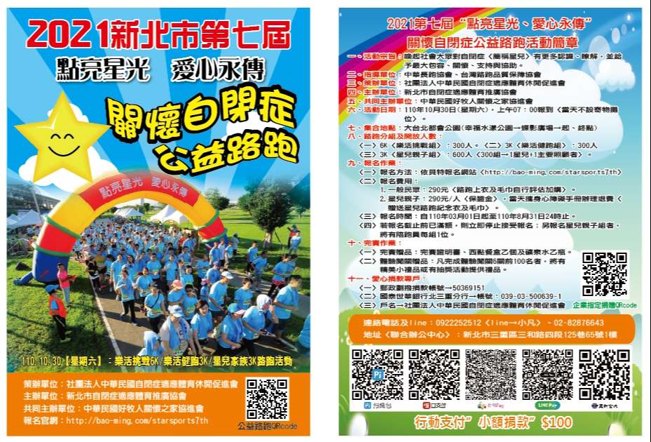 四、由於本次活動主旨乃鼓勵星兒家庭走出戶外,增加社會參 與及人際互動機會,凡星兒家族參加者均全額免費〈僅收 保證金,現場退還〉,並贈送路跑紀念服、毛巾、餐點、 闖關獎品及抽獎獎品等,此等均賴社會大眾支持,凡有捐 贈或贊助者,捐款帳戶如下: (一)銀行名稱:國泰世華銀行北三重分行 (二)戶名:社團法人中華民國自閉症適應體育休閒促進會 (三)帳號:039-03-501020-7