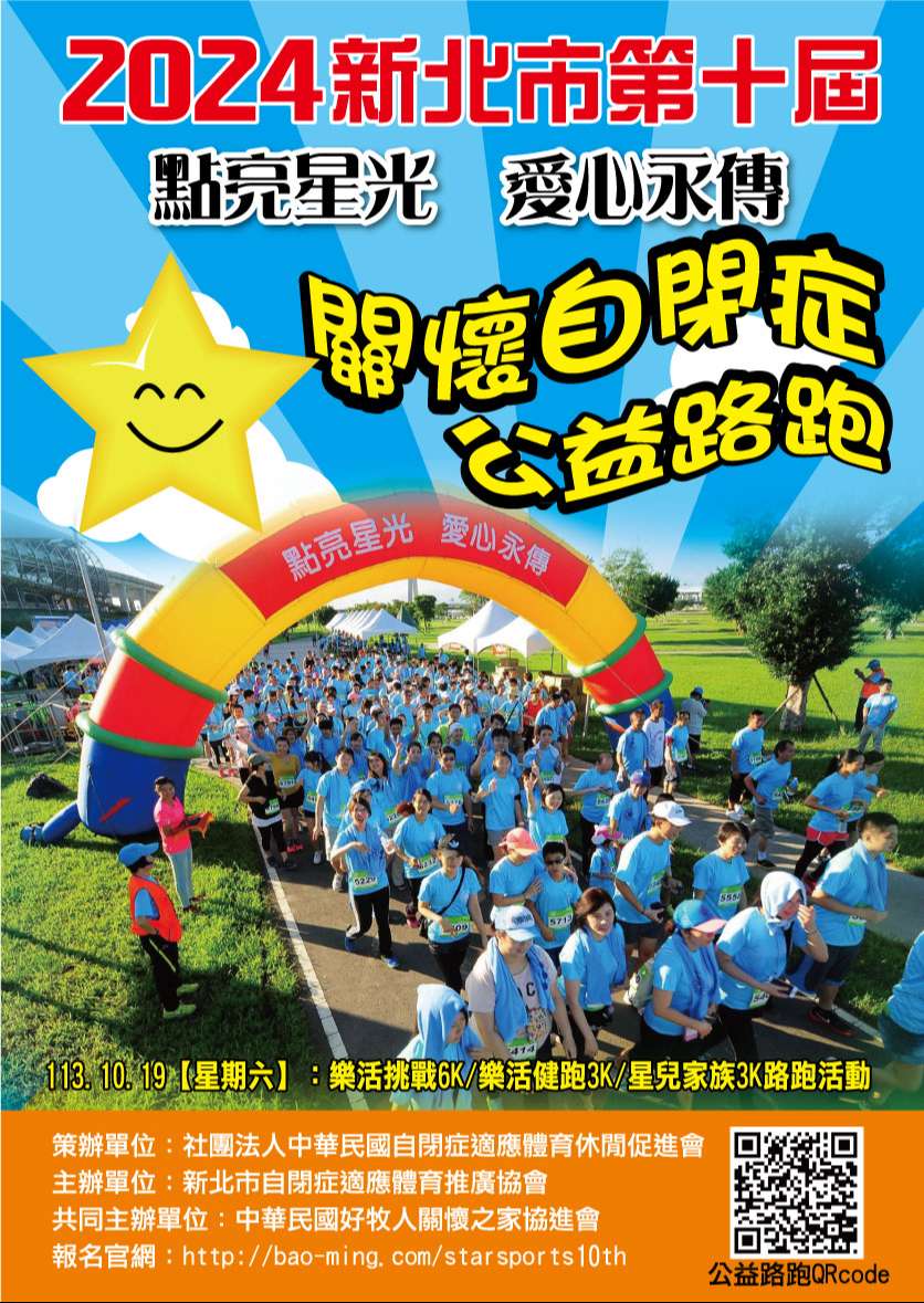 三、然為讓星兒家庭們能走到戶外與一般民眾享有同樣的體育 休閒生活,遂策畫辦理此項關懷自閉症公益路跑活動,相 關內容如下: (一)時間:113年10月19日上午7-12時。(二)地點:新北大都會公園→幸福水漾園區 (三)路跑組別及人數: 1、6K〈樂活挑戰組〉:300人。 2、3K〈樂活健跑組〉:300人 3、3K〈星兒親子組〉:600人〈300組→1星兒+1主要照顧 者〉。 (四)費用: 1、一般民眾: 390元〈路跑上衣及毛巾自行評估加 購〉。 2、星兒親子: 390元/人〈保證金〉,當天攜身心障礙手 冊現場辦理退費〈贈送星兒路跑記念衣及毛巾〉。 (五)報名時間:113年3月1日起至113年8月31日止。