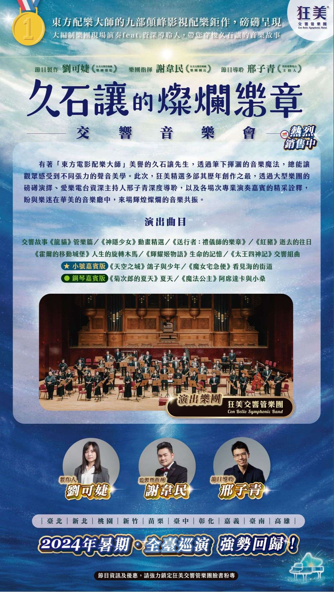 一、節目介紹:久石讓先生,身兼作曲家、指揮家、鋼琴家,及「吉卜力工作室」音樂總監的多重身分,透過筆下揮灑的音樂魔法,他總能在每部影像作品中,讓觀眾感受到不同張力的聲音美學,本節目中狂美精選多部久石讓先生歷年創作之最,盼與樂迷朋友在華美的音樂廳中,來場輝煌燦爛的音樂共振。