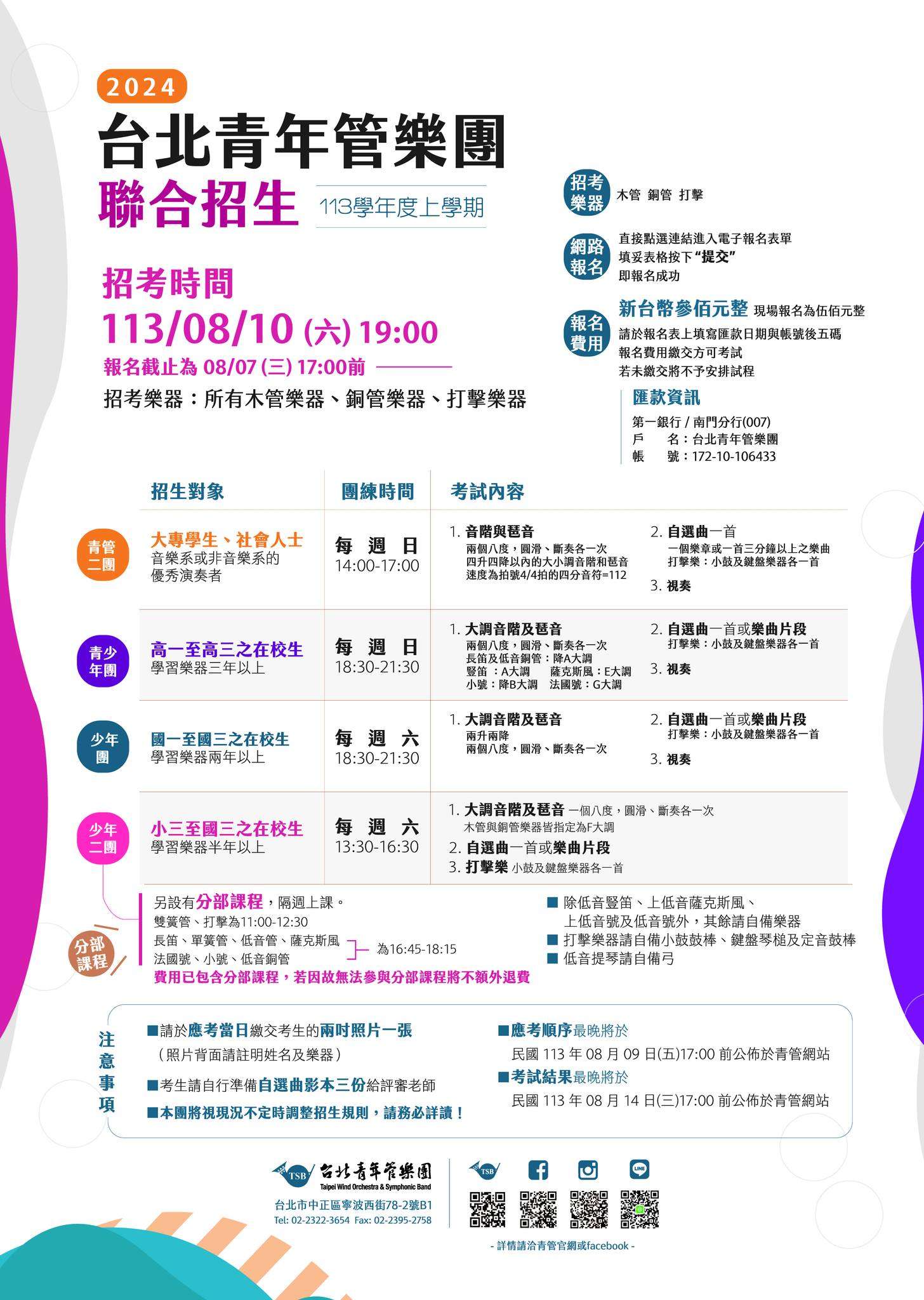 (四)相關招生資訊請至台北青年管樂團臉書粉絲專頁查詢(http://www.facebook.com/tsbgroup/)。