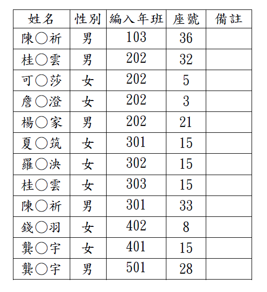 113學年度第一學期轉入生編班結果如下,請於8/30(五)上午7:40分前到校