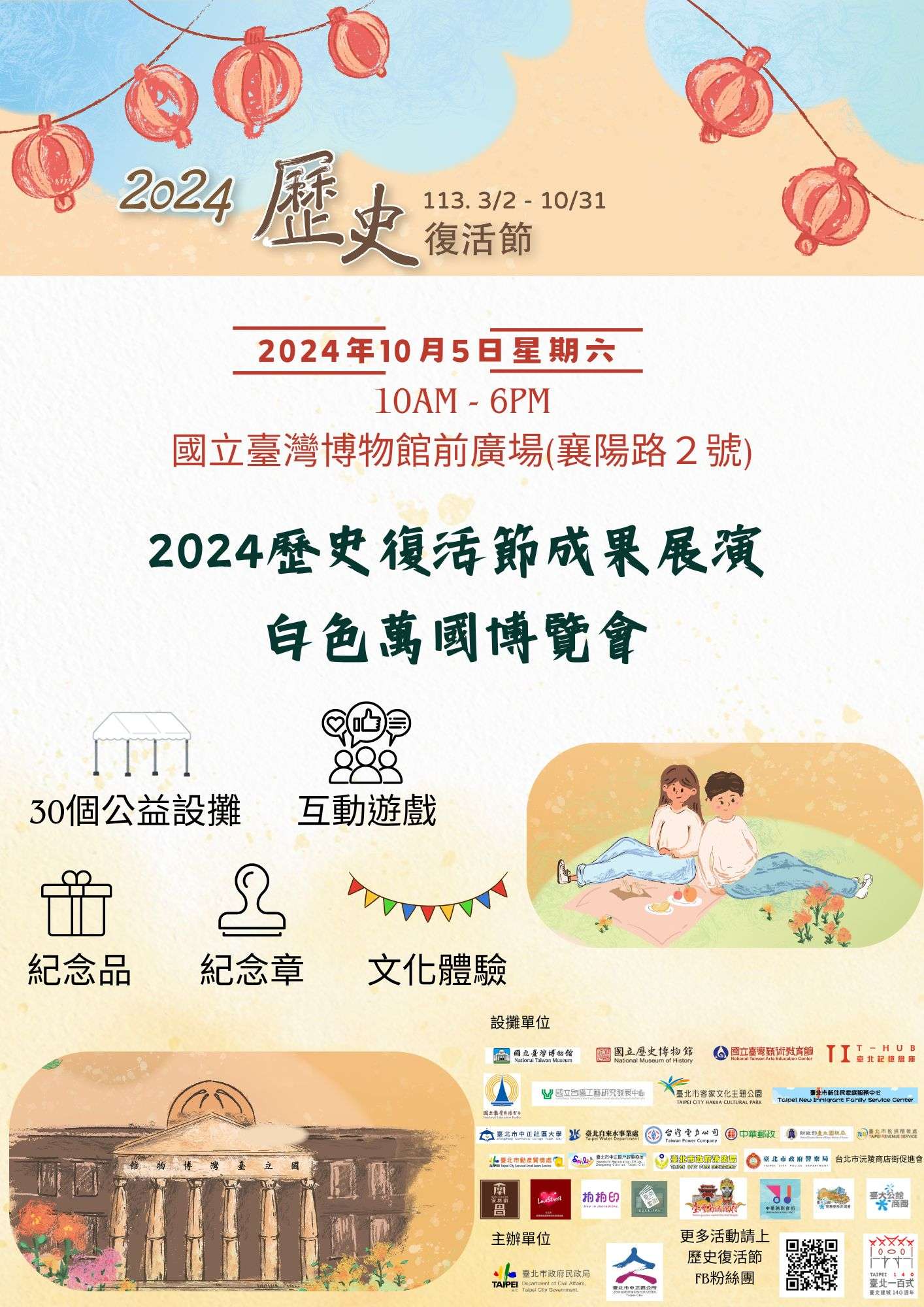 一、本區113年度基層藝文活動「2024歷史復活節:白色萬國博覽會」將於113年10月5日(星期六)上午10時至下午6時假二二八和平公園-國立臺灣博物館本館(襄陽路2號)前廣場舉辦。