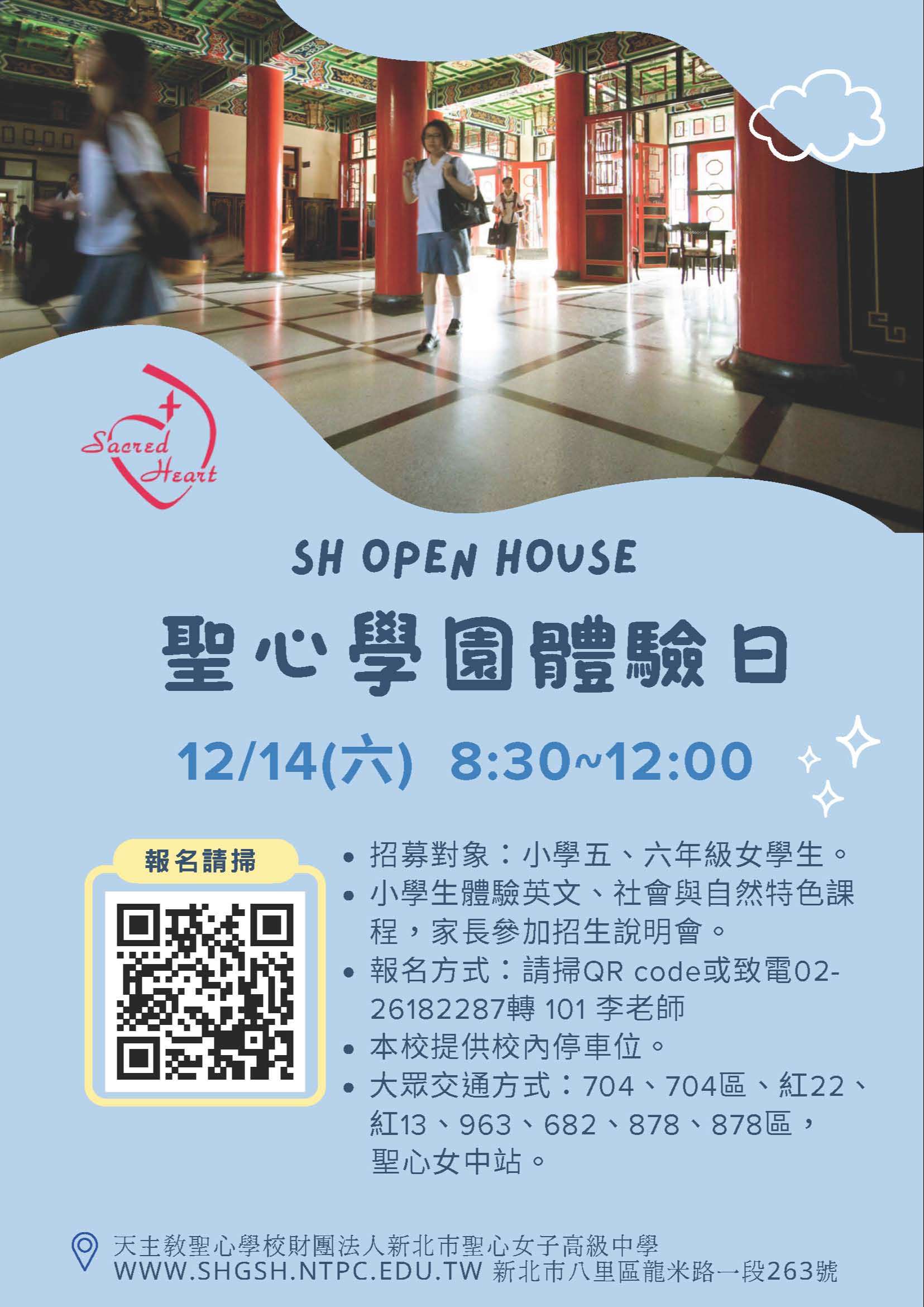 三、報名方式: (一) 報名表連結:https://forms.gle/rbhErCBZRSPhnA1Q8 (二) 或至聖心女中首頁www.shgsh.ntpc.edu.tw—最新公告 報名 (三) 聯絡人:李雪琴老師02-26182287轉101 (四) 附件:檢附活動實施計畫及海報,請惠予公告。