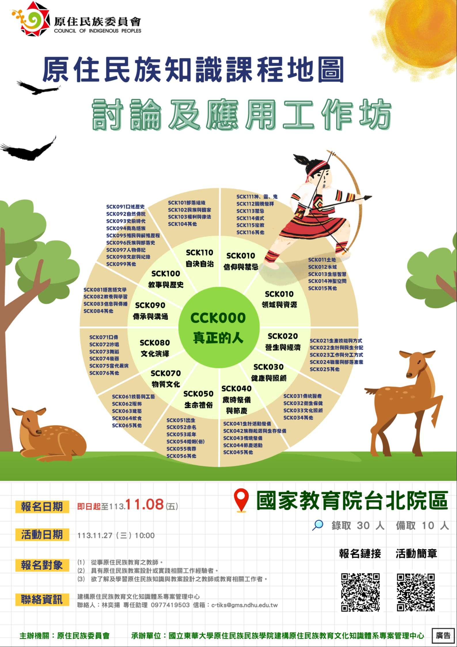 二、活動相關資訊如下: (一)活動日期:113年11月27日(星期三)上午10時00分至下 午16時00分。 (二)活動地點:國家教育研究院臺北院區11樓1101大禮堂 (臺北市大安區和平東路一段179號)。 (三)培訓對象: 1、從事原住民族教育之教師。 2、具有原住民族教案設計或實踐相關工作經驗者。 3、欲了解及學習原住民族知識與教案設計之教師或教育相關工作者。
