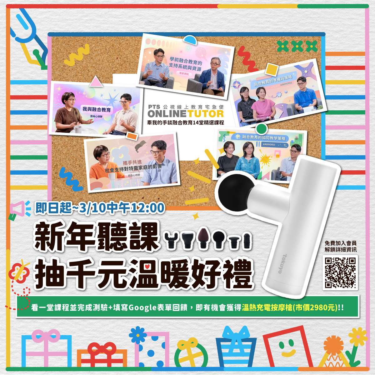 (一)為鼓勵教師參與線上研習課程,「公視兒少教育資源網」舉辦研習抽獎活動,即日起至3/10(一)中午12:00止,歡迎教師踴躍參加。