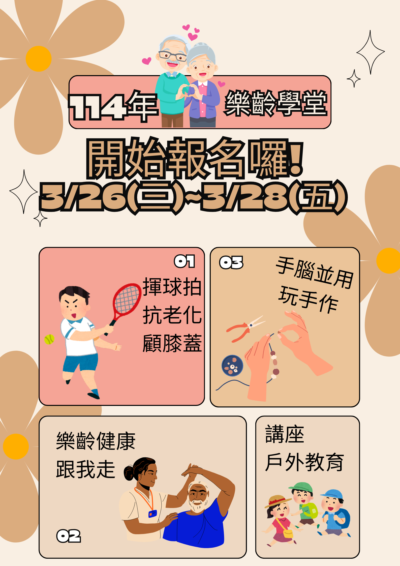 3.上課日期:樂活周三班第一期:114.04.9(三)~114.06.20(五) (共10次)