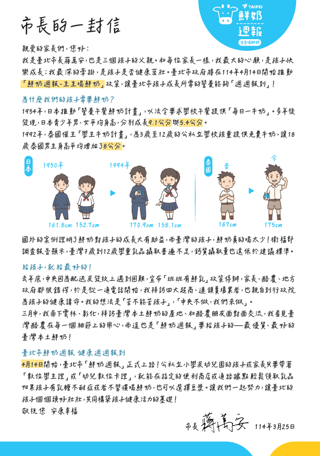 為提升本市學童健康意識與營養攝取,臺北市政府推動「鮮奶週報—生生喝鮮奶」政策,補充學童成長與發育所需之蛋白質、鈣質與多元營養素。憑卡週週領,鮮奶、健康週週報到!內容摘要如下: