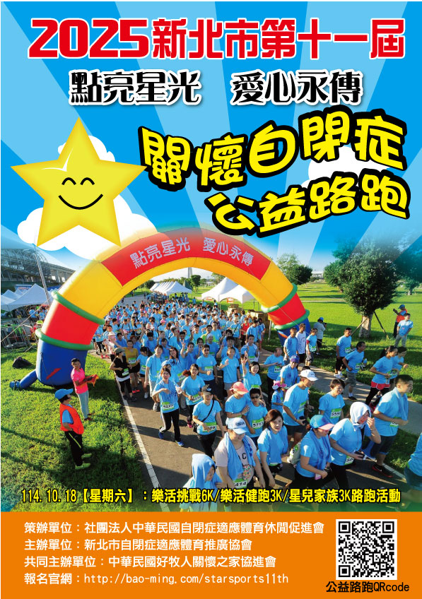 三、然為讓星兒家庭們能走到戶外與一般民眾享有同樣的體育 休閒生活,遂策畫辦理此項關懷自閉症公益路跑活動〈宣 導單張詳如附件二〉,相關內容如下: (一)時間:114年10月18日上午7-12時。(二)地點:新北大都會公園→幸福水漾園區 (三)路跑組別及人數: 1、6K〈樂活挑戰組〉:300人。 2、3K〈樂活健跑組〉:300人 3、3K〈星兒親子組〉:600人〈300組→1星兒+1主要照顧 者〉。 (四)費用: 1、一般民眾: 390元〈路跑上衣及毛巾自行評估加 購〉。 2、星兒親子組: 390元/人〈保證金〉,當天攜身心障礙 手冊現場辦理退費〈贈送星兒路跑記念衣及毛巾〉。 (五)報名時間:114年3月1日起至114年8月31日止。