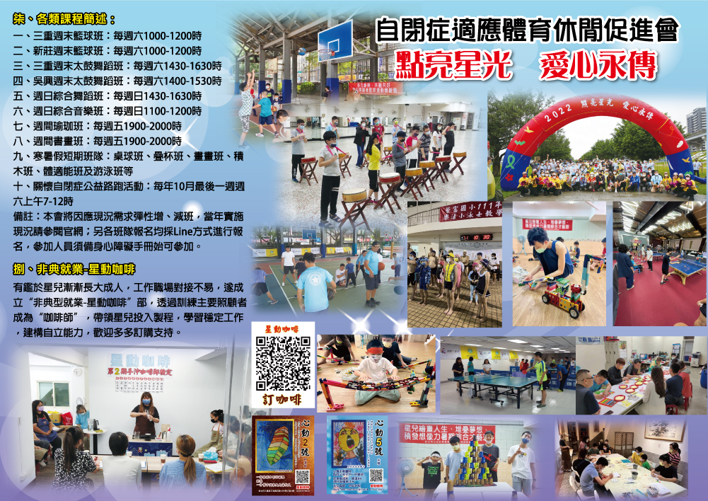 二、本會長期致力於自閉症者〈以下簡稱“星兒”〉各項體育 〈籃球、桌球、水適能、舞蹈等〉及休閒〈藝術創作、音 樂培養、手作工藝等〉等服務,期能提供星兒家庭專屬合 適的學習環境,不斷成長〈簡介單張如附件一〉。
