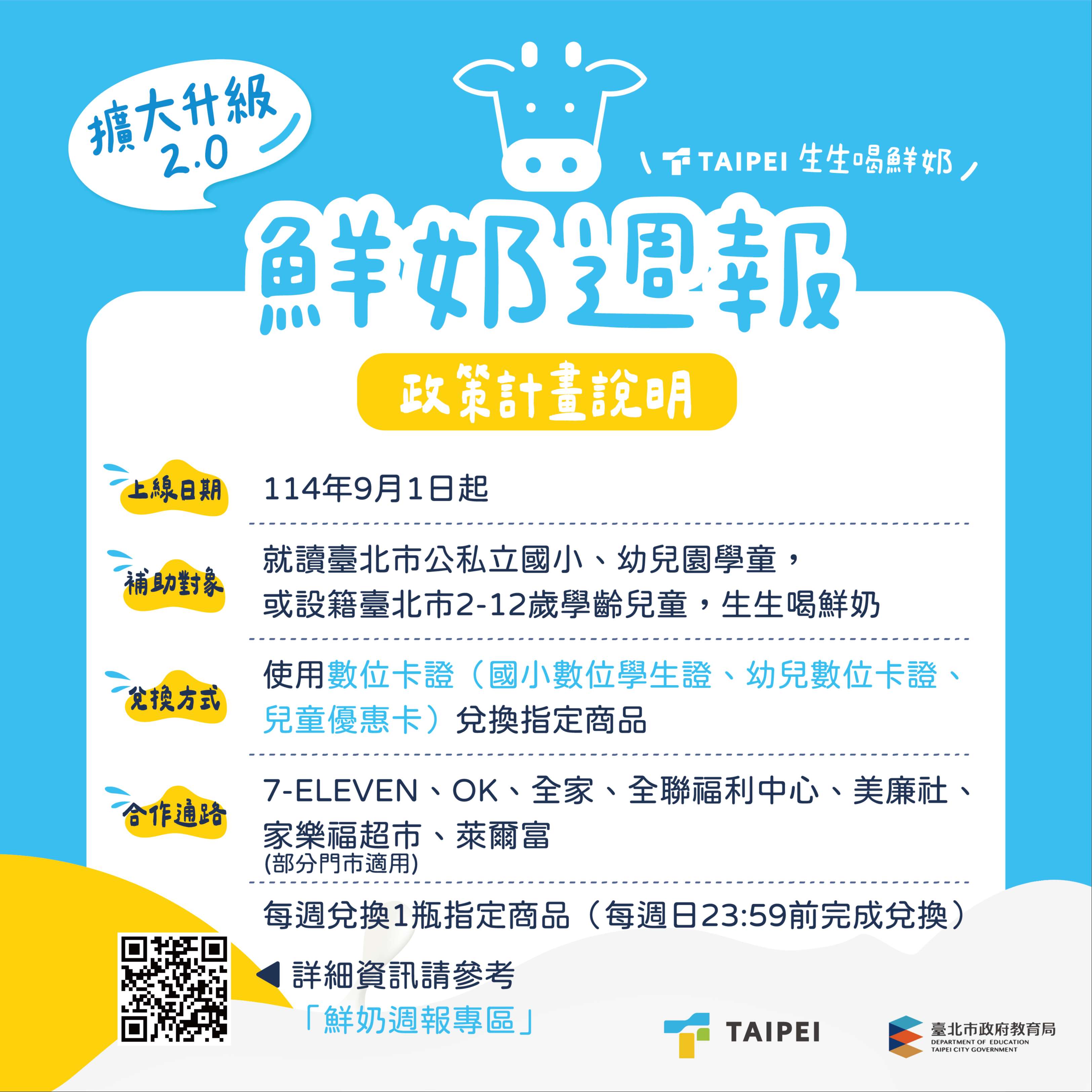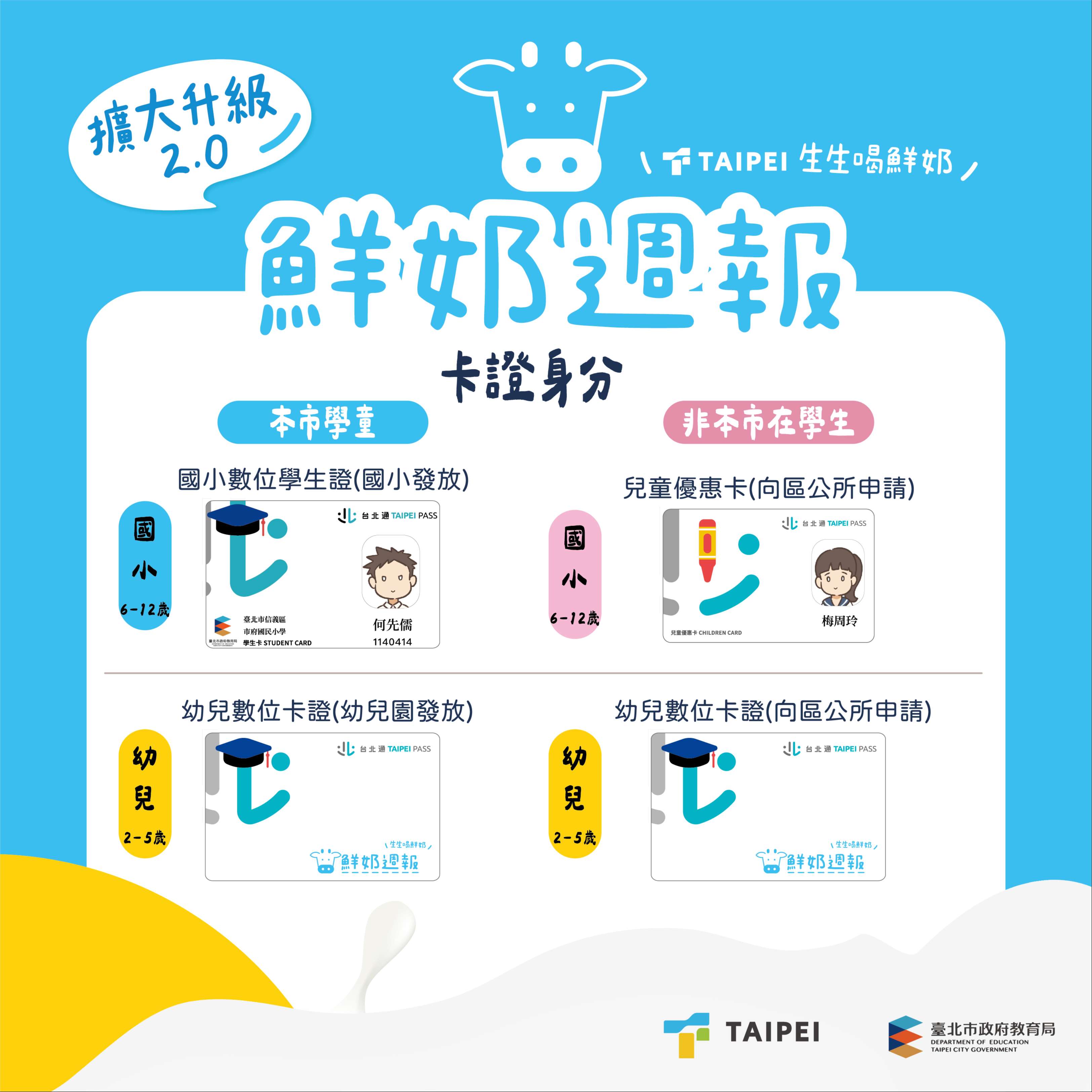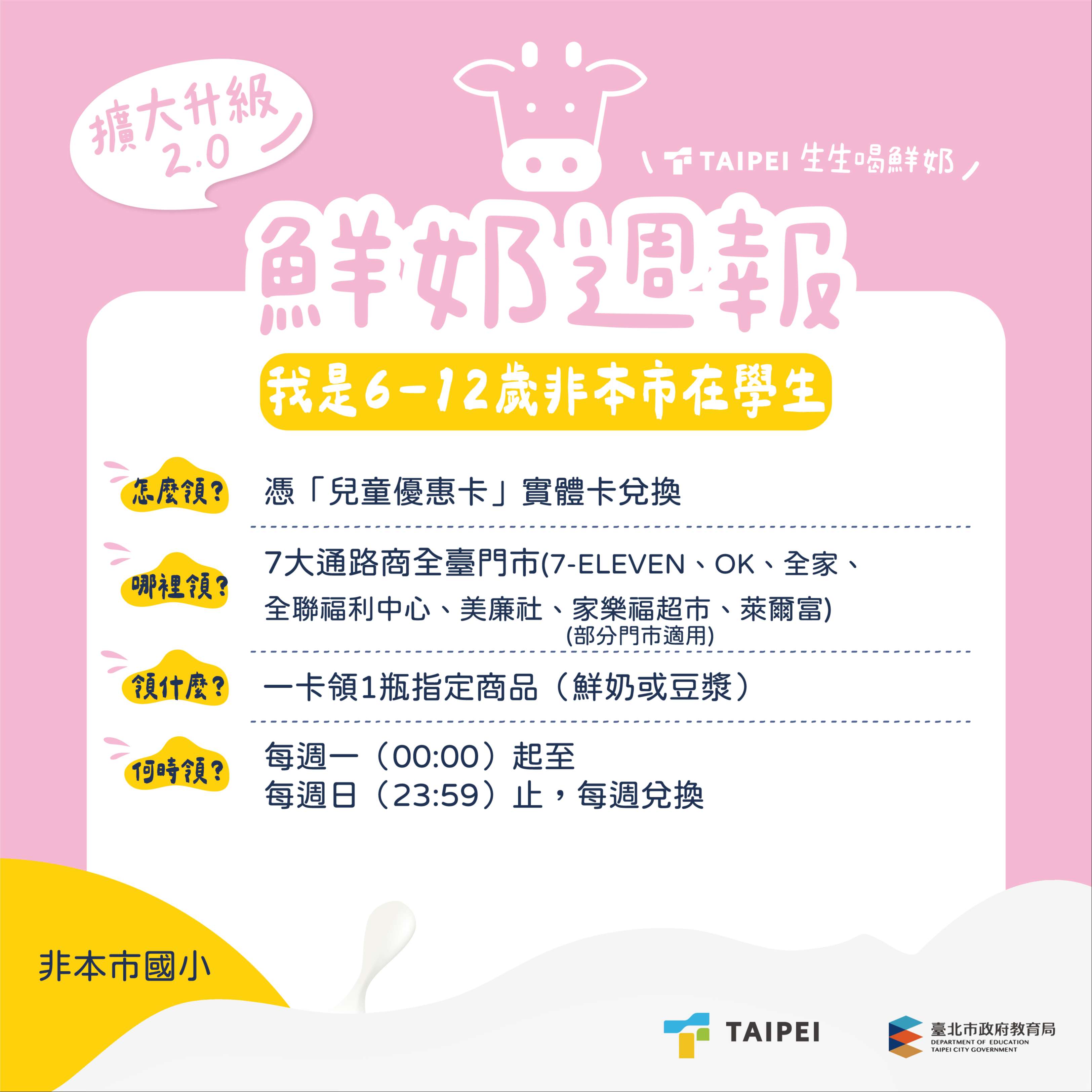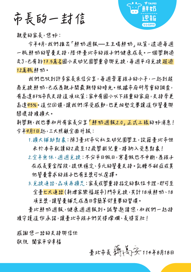 鮮奶週報9月1日擴大升級!就讀或設籍臺北市2-12歲學齡兒童,憑數位卡證至指定通路即可兌換鮮奶或豆漿,全年不中斷!詳如下方市長的一封信、海報、附件及官網https://milk.tp.edu.tw/