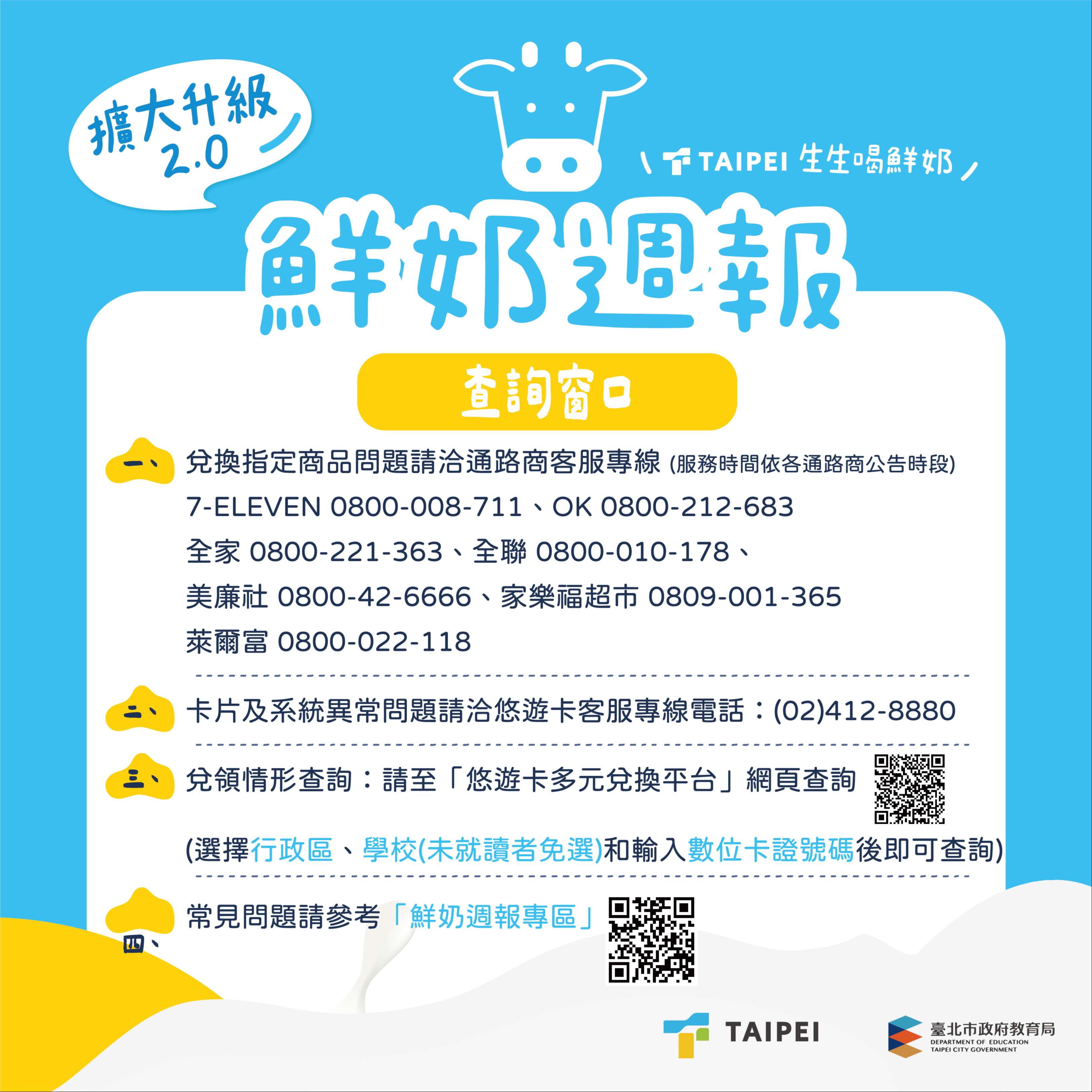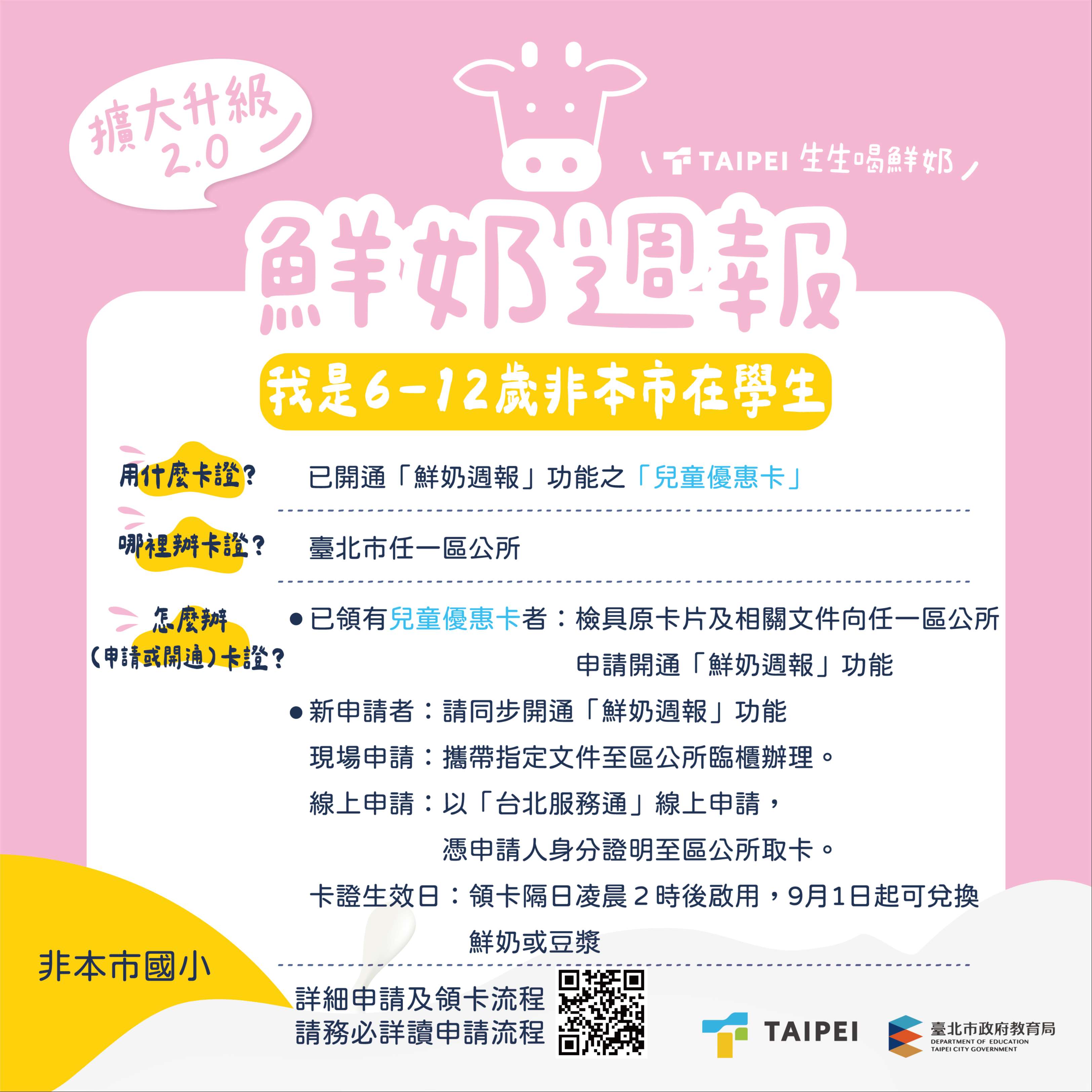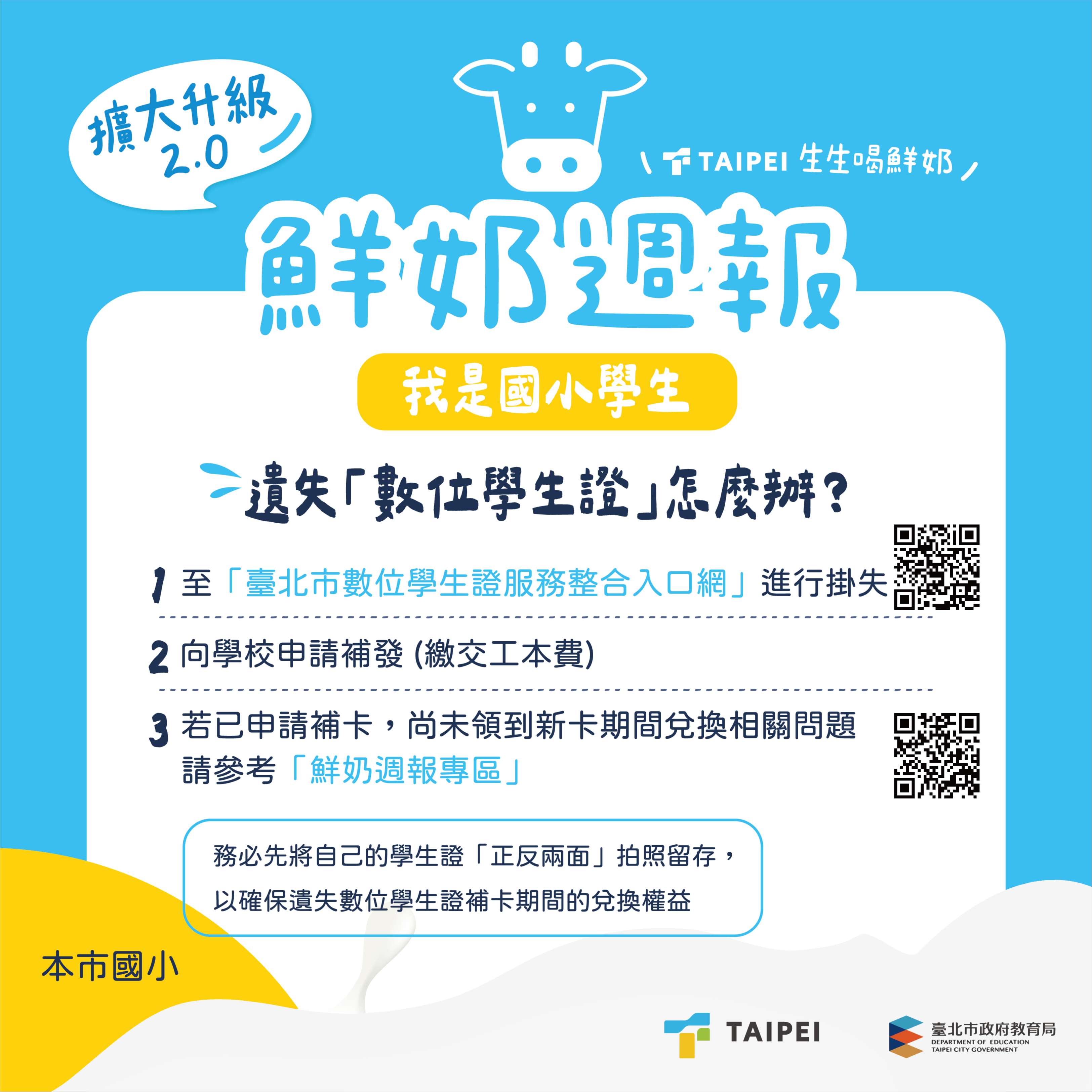 鮮奶週報9月1日擴大升級!就讀或設籍臺北市2-12歲學齡兒童,憑數位卡證至指定通路即可兌換鮮奶或豆漿,全年不中斷!詳如下方市長的一封信、海報、附件及官網https://milk.tp.edu.tw/