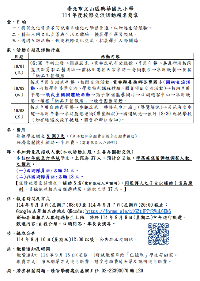 興華國小誠摯地邀請四~六年級學生參加114年度校際交流活動,內容包含雲林在地教育、國術文化體驗、雲林縣台西鄉崙豐國小共學交流、學校特色課程體驗、體育項目交流活動、雲林布袋戲館、板陶窯交趾剪黏工藝園區、北港朝天宮、萡子寮喔熊藝術村、興隆毛巾工廠、芳苑海空步道、鹿港老街古蹟巡禮等,透過互訪活動,促進校際文化交流,拓展學生人際關係。報名前煩請家長先詳閱以下注意事項: