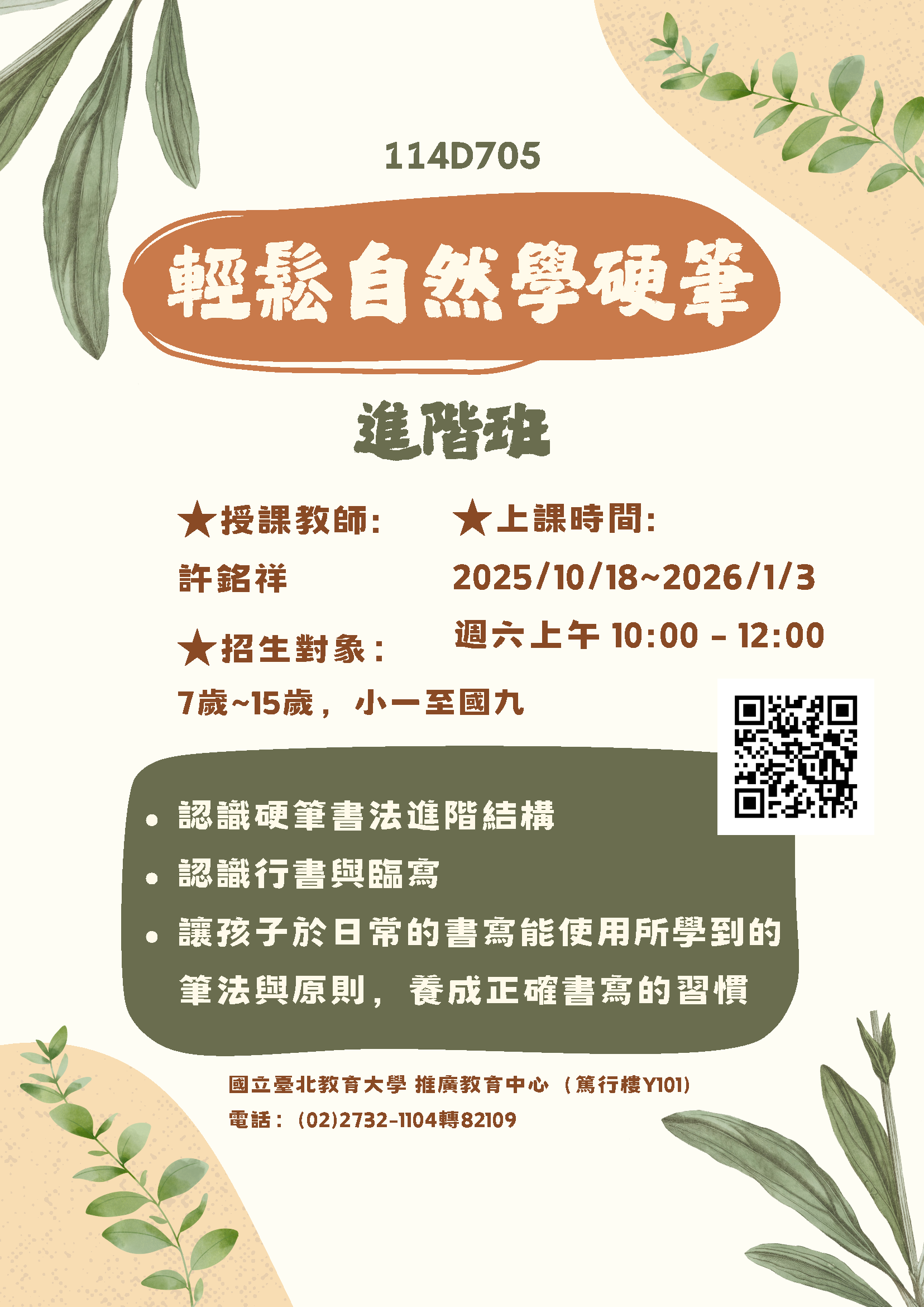 二、「114D705 輕鬆自然學硬筆進階班」課程時間為114年10月 18日至115年1月3日,每周六上午10:00 - 12:00,合計2小 時,12次。課程費用為每人6800元,材料費250元,初次報 名需繳交報名費300元,網頁https://cce.ntue.edu.tw /course/5869。