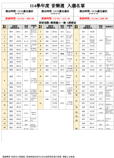 由於在彩排後,表演節目可能會有些微調或修正,故入選名單僅供參考,最終表演順序請參照節目單。