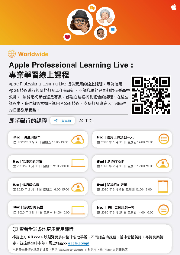 (一)115年1月9日(星期五)下午12時至1時,課程主題: iPad溝通與協作,報名網址:https://s.apple.com /dY7v9u7LN0