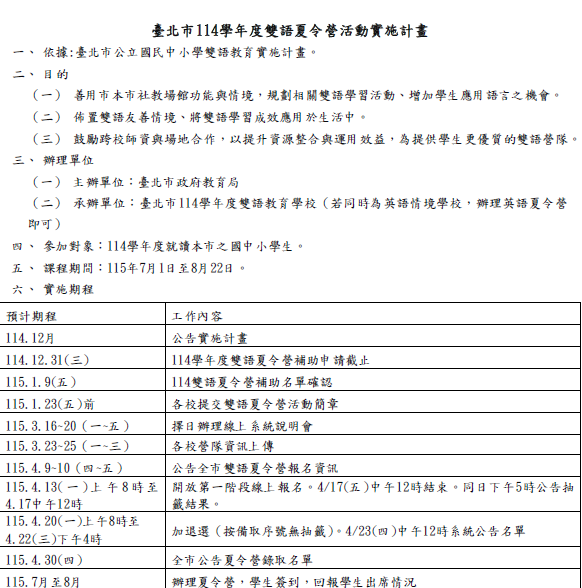 本校未辦理雙語夏令營活動,如欲參加,請參考下列期程,並搜尋「文山區雙語國小」