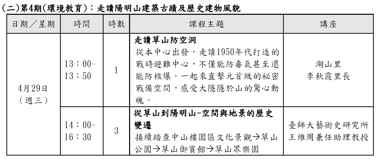 研習地點:(一)第3期:臺北市教師研習中心中正堂。 (二)第4期:由臺北市教師研習中心出發,戶外路線詳課程主題。